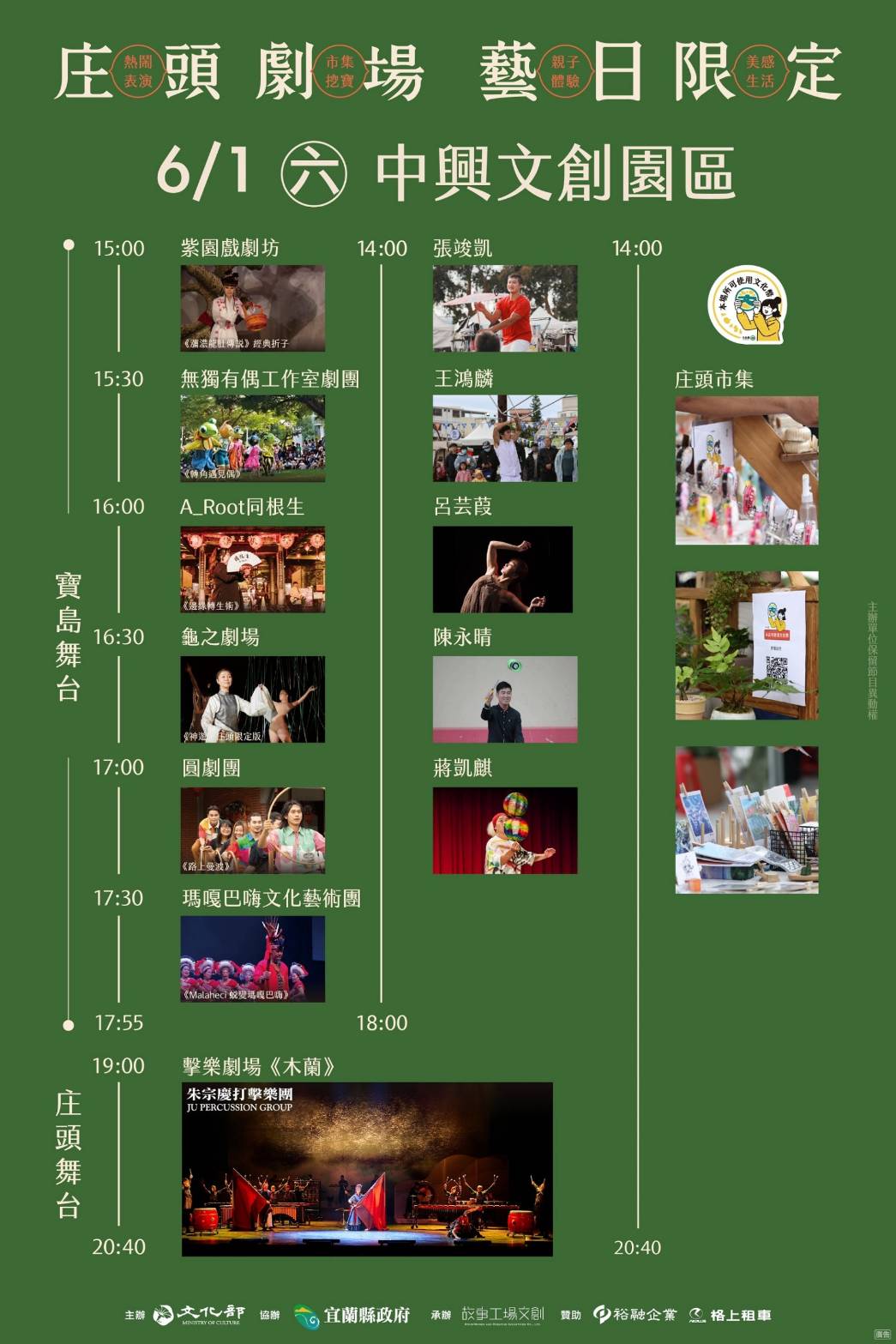 除了精彩絕倫的演出節目,現場還有豐富多元的「庄頭市集」,別具特色的文創品牌,可使用文化部推出的「文化幣」進行消費;並有臺灣特技舞蹈協會帶來多位街頭藝人的演出,包含造型氣球、雨傘滾球、高空晃管、雙人特技、立方體、扯鈴和花式籃球,不容錯過。