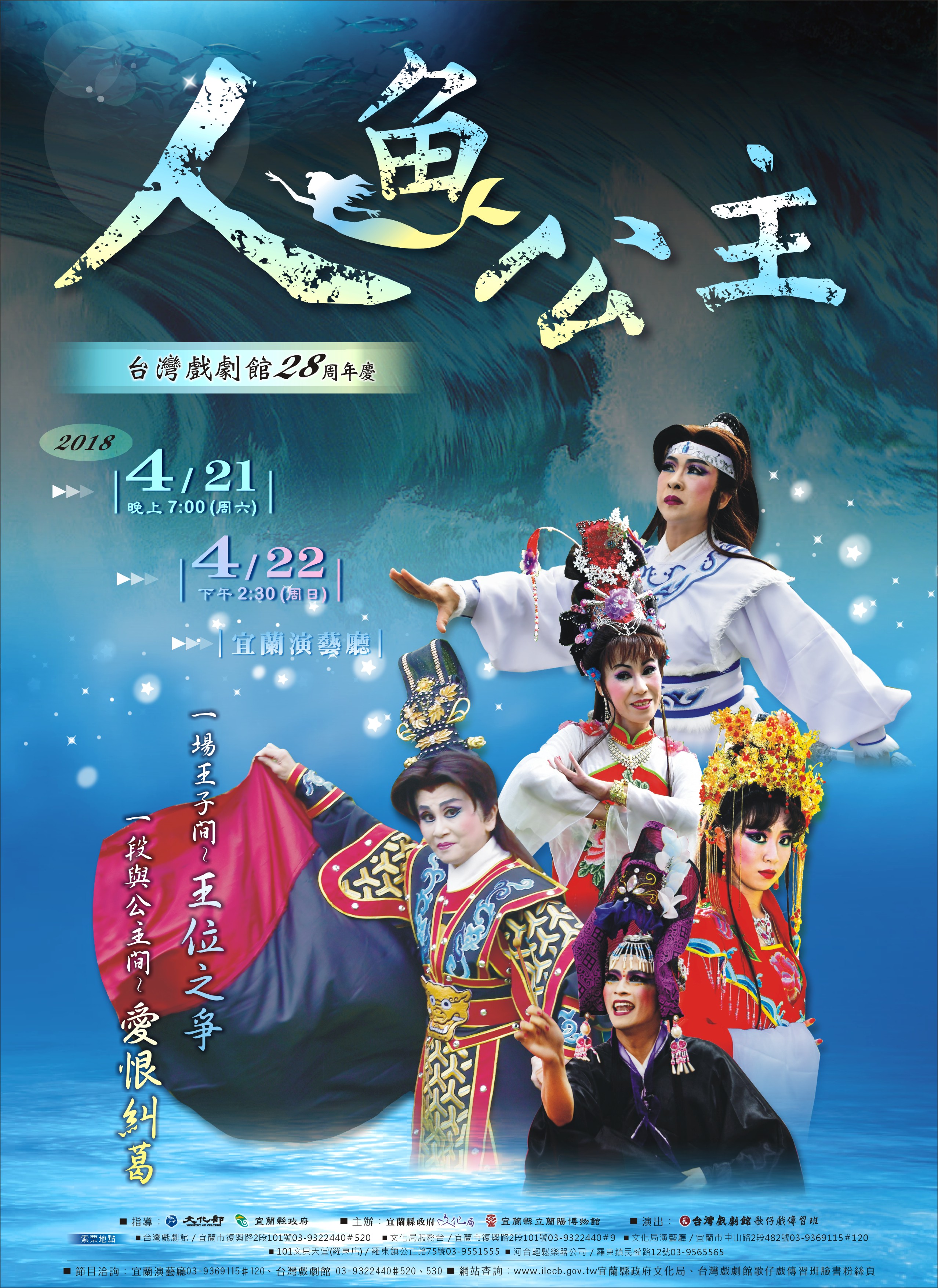 2018年適逢台灣戲劇館28周年館慶,為展現薪傳教育成果,歌仔戲傳習班繼2015年《白雪與魔鏡》後,這次再度取材西方經典童話故事《美人魚公主》,新編創意歌仔戲《人魚公主》,融合中西方文化元素,創新戲文加上創意舞美,充滿新鮮感及趣味性‧這齣老少咸宜的歌仔戲,將在4月21晚上7時及4月22日下午2時30於宜蘭演藝廳呈獻。