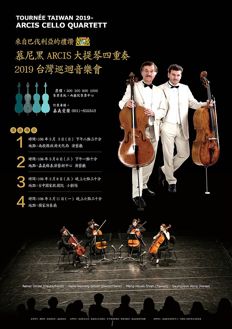 謝元富院長表示,慕尼黑 ARCIS 大提琴四重奏演出的場次分別是~ 3/3(日)下午二時卅分南投縣政府演講廳(索票);3/6(三)下午一時嘉義縣表演藝術中心(索票);3/8(五)晚上七時卅分在台中歌劇院小劇場(購票);及 3/11(一)晚上七時卅分在國家兩廳院演奏廳(購票)。愛好音樂的朋友請至兩廳院售票系統購票。
