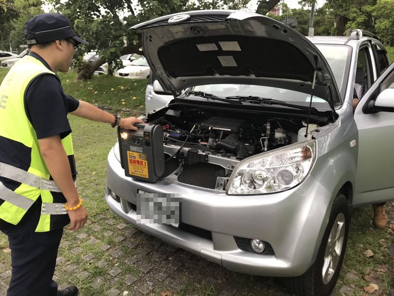 【記者林周龍/宜蘭報導】邱姓男子戴著全家人到國立傳統藝術中心旅遊,下車時忘記關閉大燈,以致電源耗盡無法啟動引擎,因人地生疏,不知道那裡有汽車電氣行可充電,於是打電話向羅東警分局利澤派出所求救,警員楊維倫接獲電話攜帶充電器材前往協助電瓶充電,邱姓男子一家人對在地警察熱心服務精神深表感激。