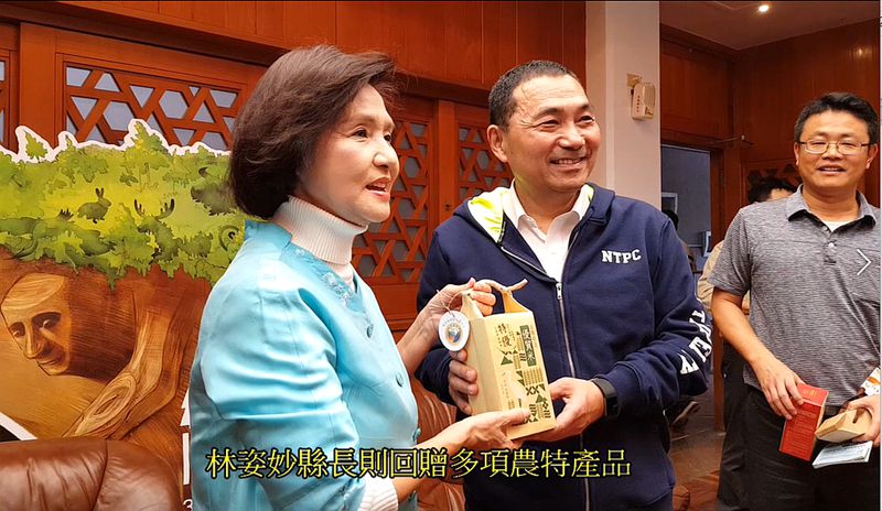 侯友宜市長拜會時特別致贈鶯歌的陶瓷品,林姿妙縣長則回贈多項禮品,宜蘭嚴選有機冠軍米、酒、有機茶、金棗膠、綠博招待券等。侯市長說「哇,一項換五項」,還問「到綠博參觀要不要門票?」,林縣長笑著說「開幕那一天免費」。