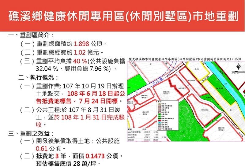 縣府地政處18日在縣務會議中,就市地重劃成果作專題報告,目前正執行中的四個地重劃案,有部分抵費地共20餘筆土地,將於7月24日上午10時在縣政府文康中心開標。