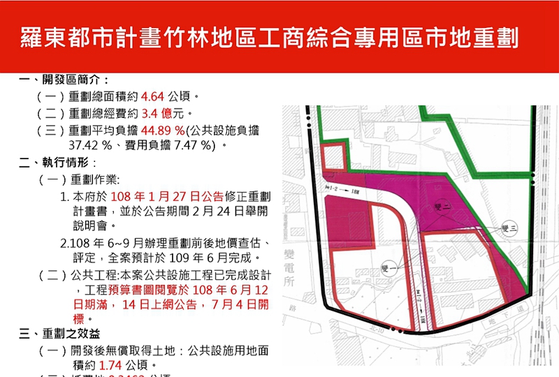 (二)公共工程: 108年5月9日召開工作計畫書 審查會議結論,市地重劃工程部分以11月提 送細部計畫成果,12月招標文件定稿,109 年6月竣工為執行目標。