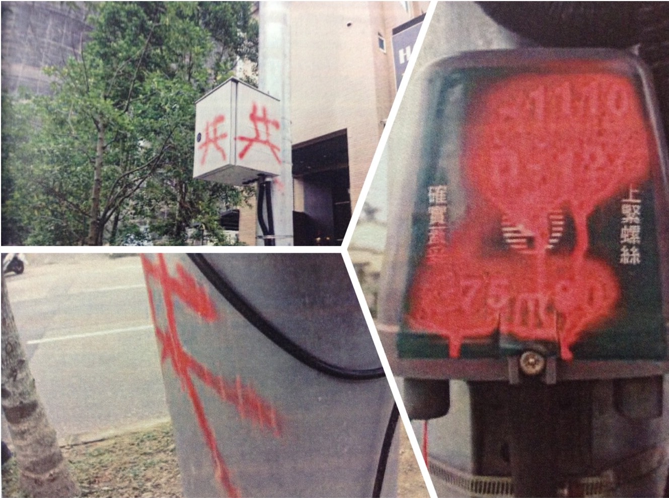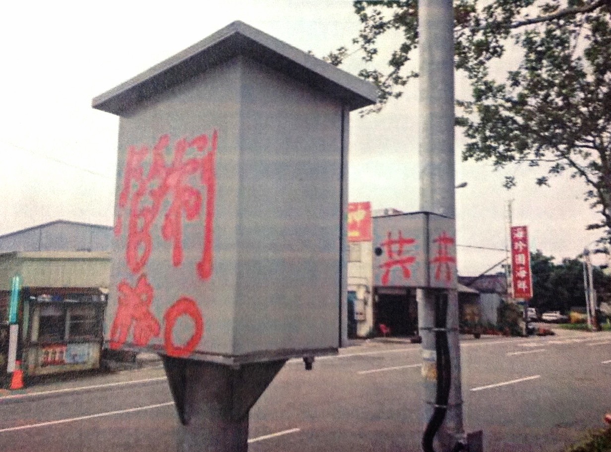 宜蘭縣內近來陸續傳出多處路燈、交通號誌燈被噴漆或剪線破壞無法運作,礁溪分局警方獲報後,即調閱本縣轄內數百隻監視器,發現一名頭戴白色工程帽身穿紅色衣服涉嫌重大,該名女子騎乘機車四處破壞路燈、號誌並以紅色油漆在路燈控制器上塗鴉「共」字。