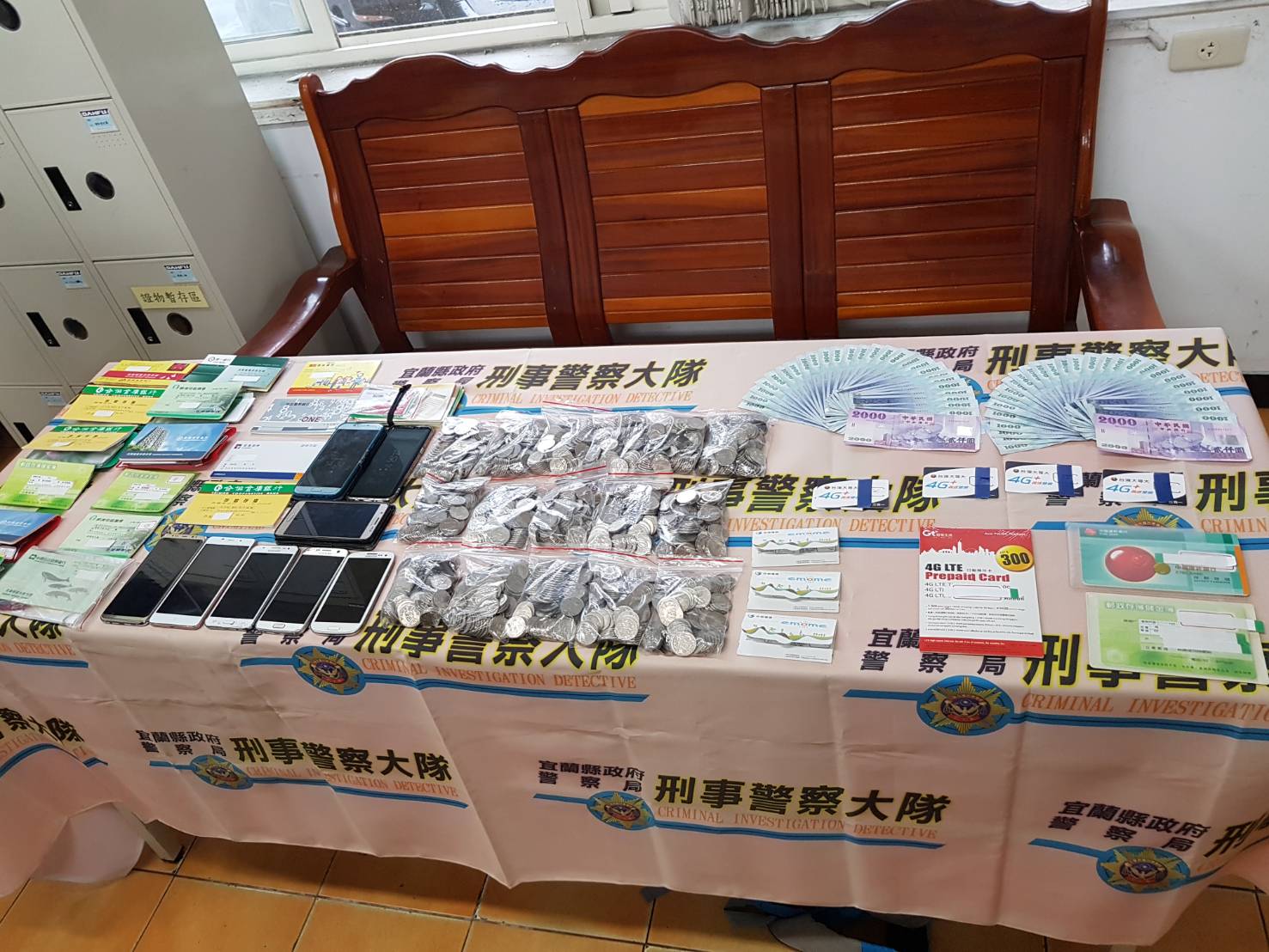 警方查扣手機10支、SIM卡15張、金融帳戶存摺20本、提款卡12張及犯罪所得現金8萬4仟元、記事本等相關贓證物。(記者邱淑珍/攝影)