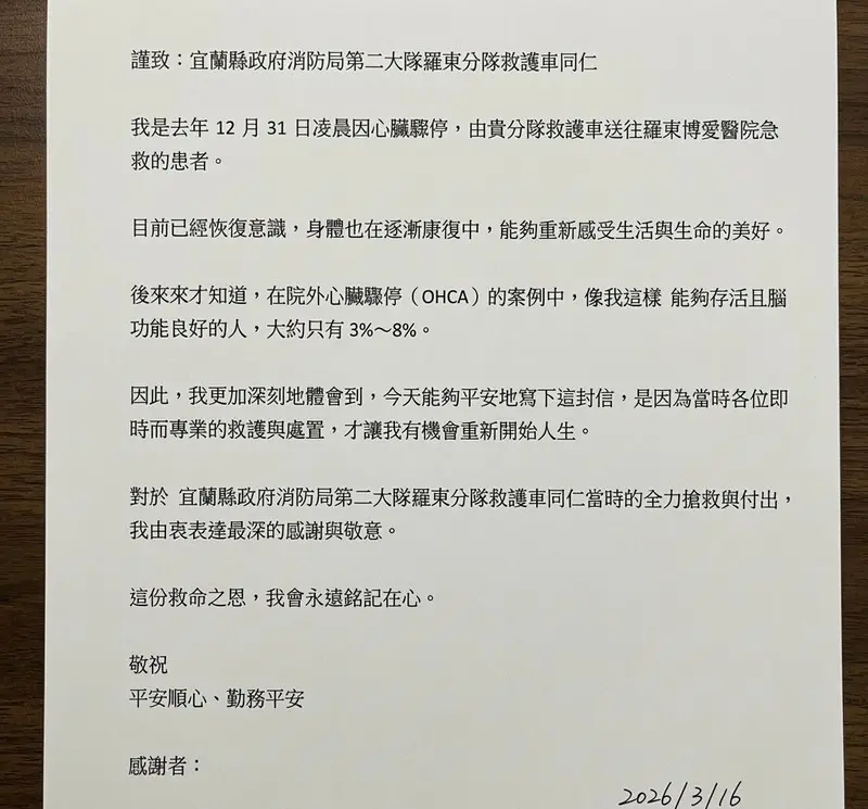 事發兩個多月後,患者張先生順利康復出院,特地回到羅東分隊,親手遞上感謝信,向當時參與搶救的救護人員表達最誠摯的謝意。他在信中寫道:「謝謝救護人員當時即時而專業的處置,讓我有機會重新開始人生。對於宜蘭縣政府消防局第二大隊羅東分隊同仁的全力搶救與付出,致上最深的感謝與敬意。」