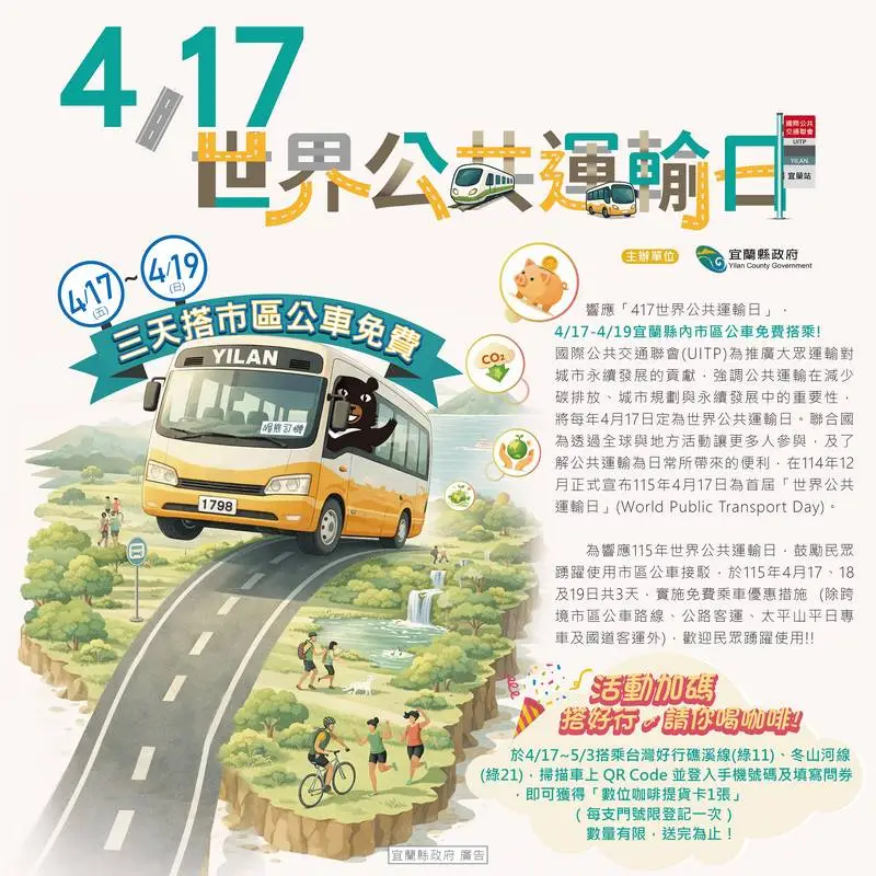 為響應首屆「世界公共運輸日」,宜蘭縣政府宣布自4月17日至19日推出為期3天的市區公車免費搭乘措施,鼓勵民眾以大眾運輸取代私人運具,實踐綠色生活與永續觀光。此次優惠適用於宜縣市區公車路線(不含跨境市區公車、公路客運、太平山專車及國道客運)。