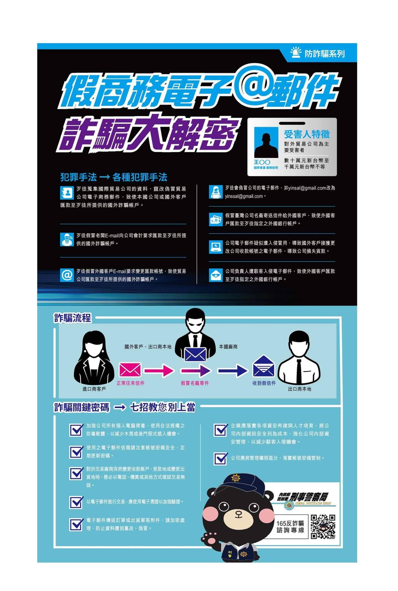 宜蘭警分局提醒,許多國內企業仍習慣使用電子郵件與客戶聯繫以撙節開銷,卻給予詐騙集團可趁之機,茲略述假商務電子郵件詐騙手法如下: