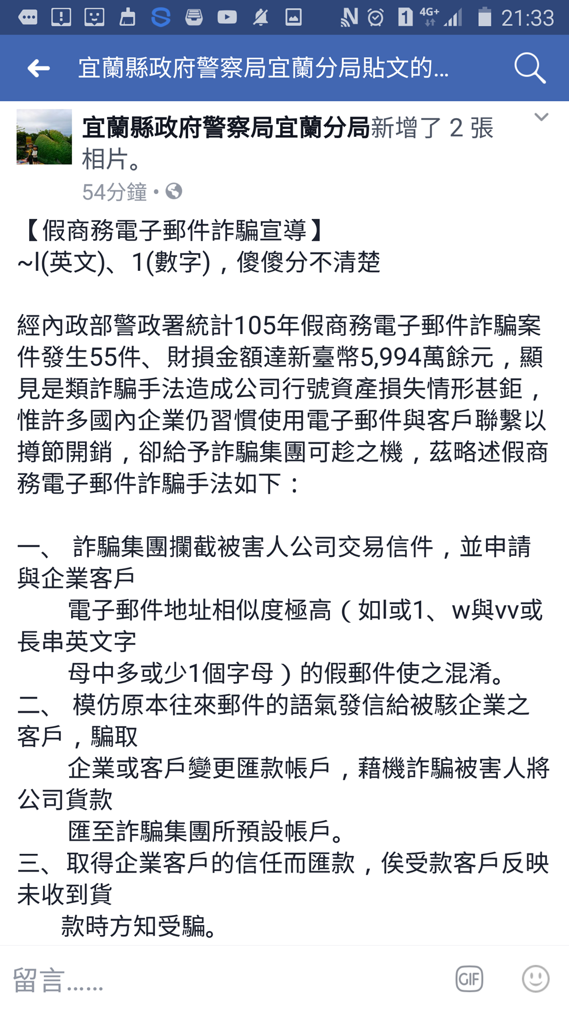宜蘭警分局指出,根據內政部警政署統計,105年假商務電子郵件詐騙案件發生55件、財損金額達新臺幣5,994萬餘元,顯見是類詐騙手法造成公司行號資產損失情形甚鉅,宜蘭警分局提醒社會大眾特別留意新興電子商務詐騙手法,尤其注意:別英文、數字傻傻分不清!
