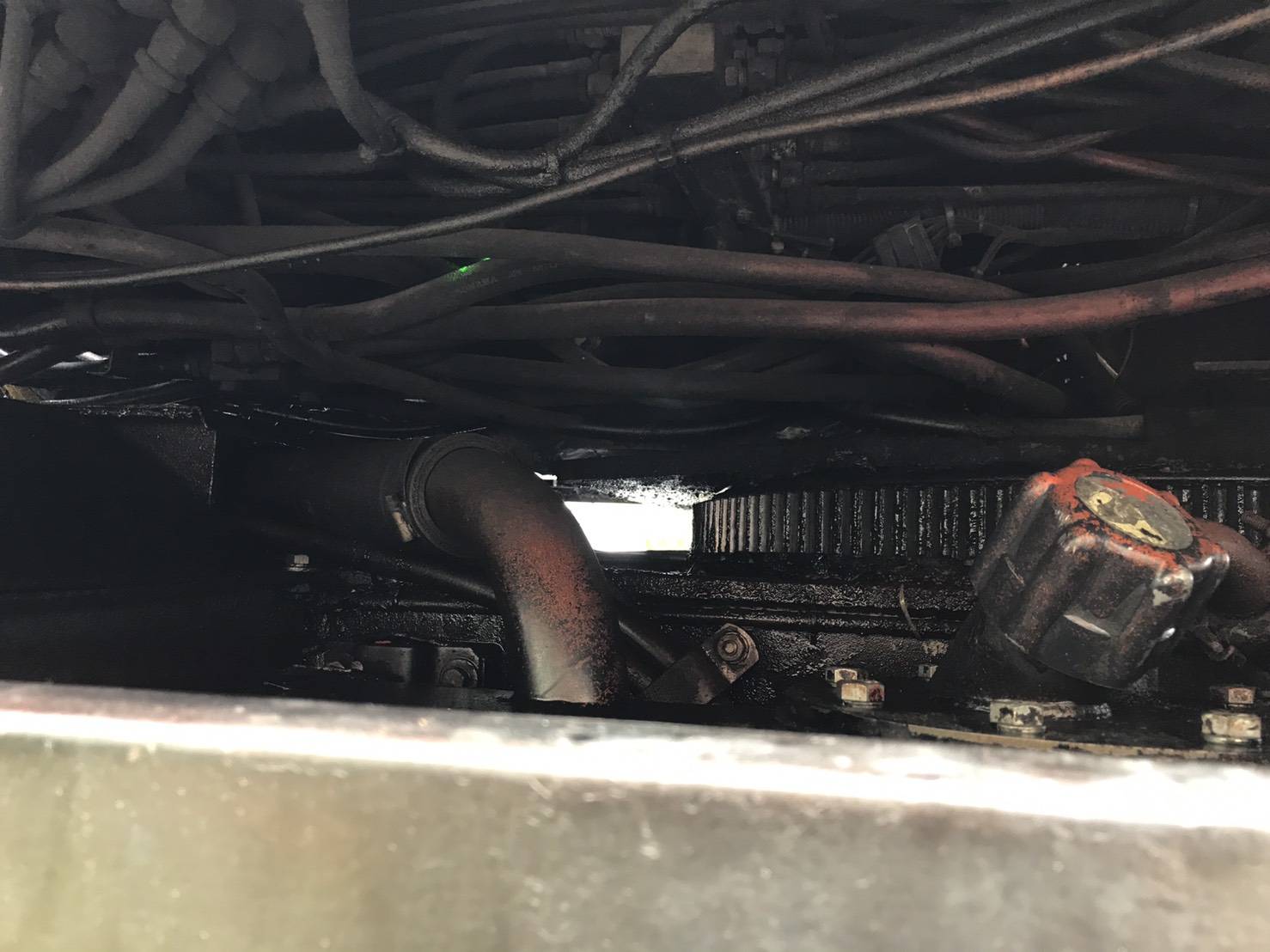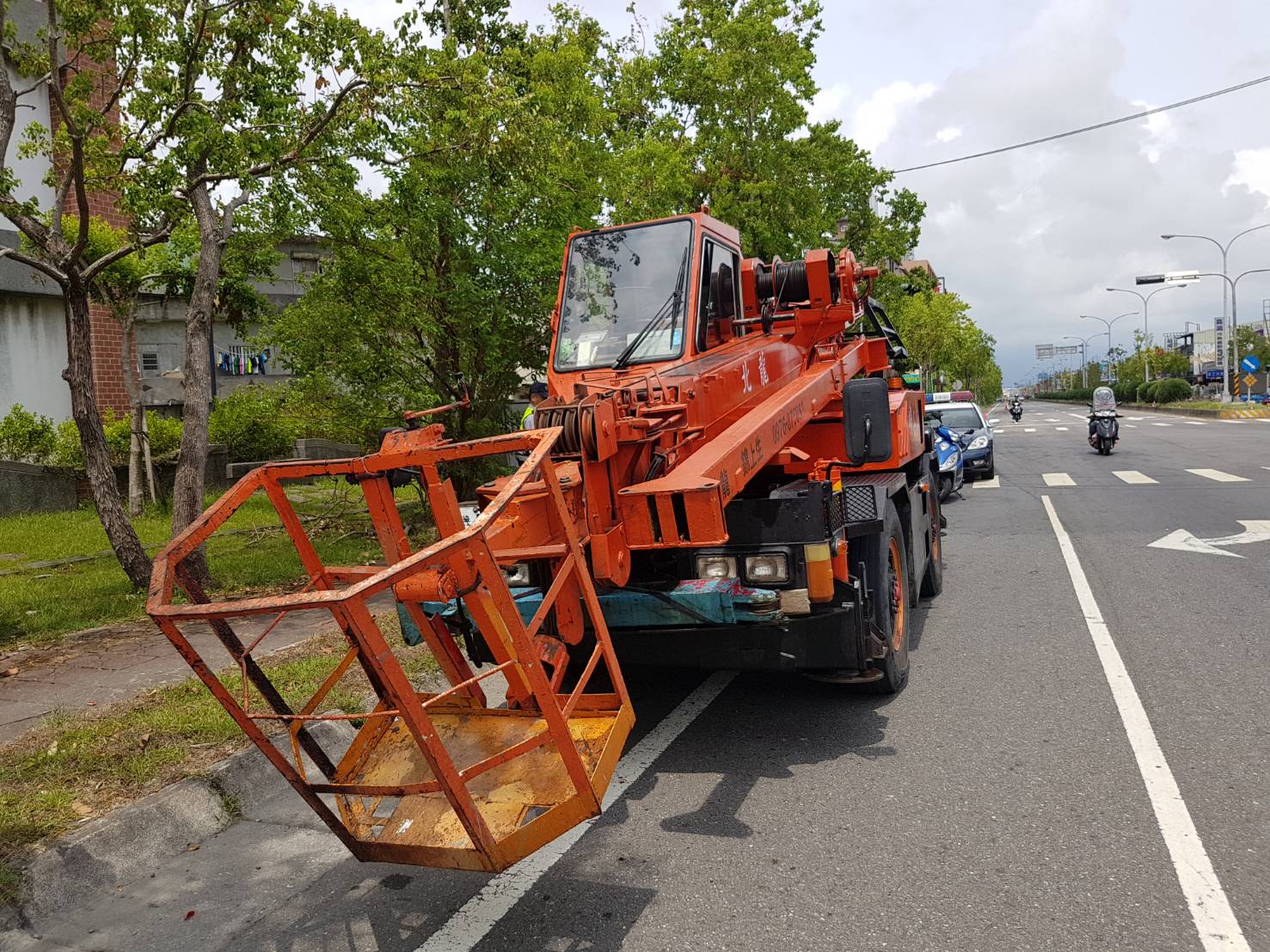 造成路面油漬的肇事車是錦0升工程行輪式起重機。(記者邱淑珍/攝)