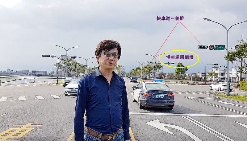 李偉華到到縣民大道路口現場去看,單向慢車道一線,快車道有兩線,還有一左轉車道;也就是說單向就是四線道,雙向是八線道。奇怪的是慢車道上的號誌有四個燈,慢車道只能直行或右轉,不能直接左轉,所以實際上並未發揮四個燈的功能。