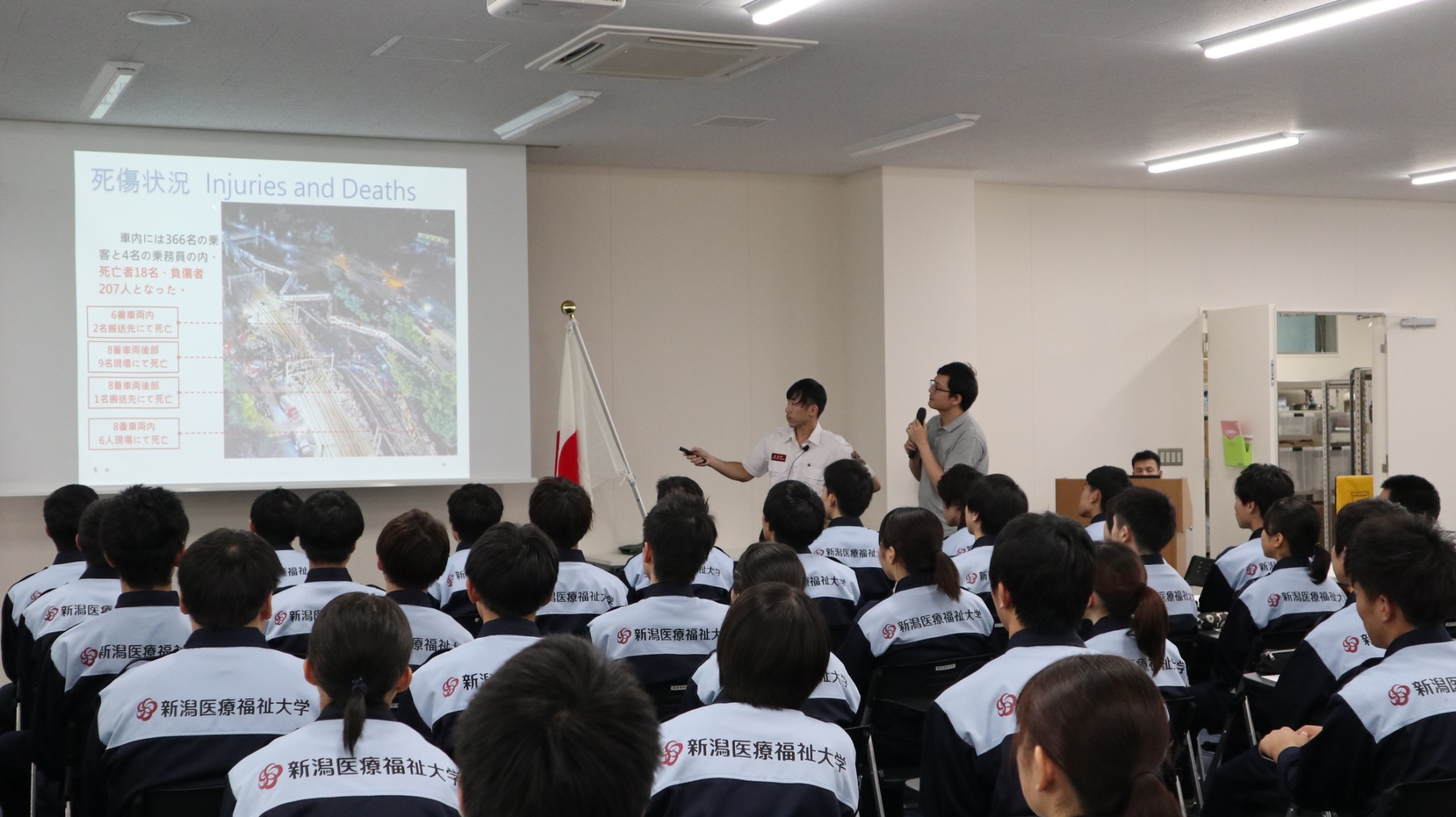 這次研討會消防局共派5名高級救護技術員,在6月17日前往日本,6月18日參訪新潟市消防局,並至新潟醫療福祉大學,與救急救命學科學生分享救災經驗,當結束一整天的行程後,一行人繼續在飯店討論隔日研討會的細節時,不料在晚間10時22分時,新潟地區竟發生芮氏規模6.8地震,當時所有同仁立即依照「趴下、掩護、穩住」原則自行保護,於地震過後立即離開房間。