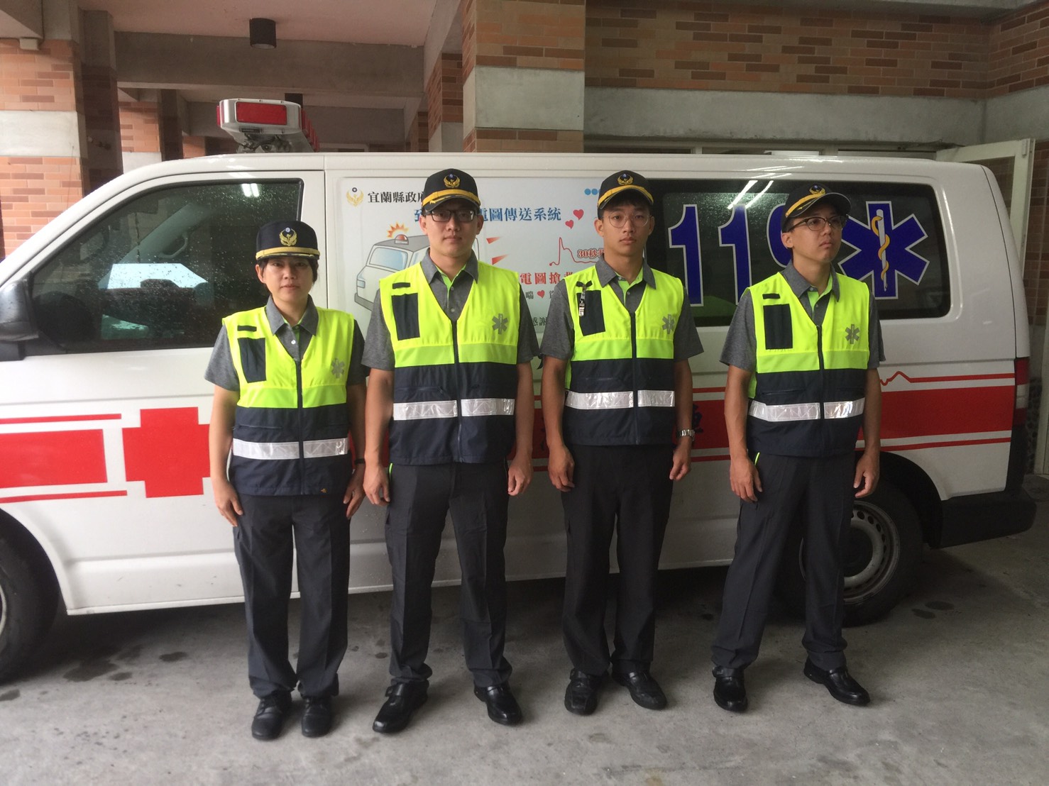 新式救護POLO衫,顏色為灰色,左前胸有依宜蘭縣特色所設計的標誌(宜蘭縣龜山島及浴火鳳凰圖案),背後有白色救護車圖樣及「宜蘭消防」、「EMT」字樣可供辨識,另外著救護背心,以提高救護同仁執勤安全性。
