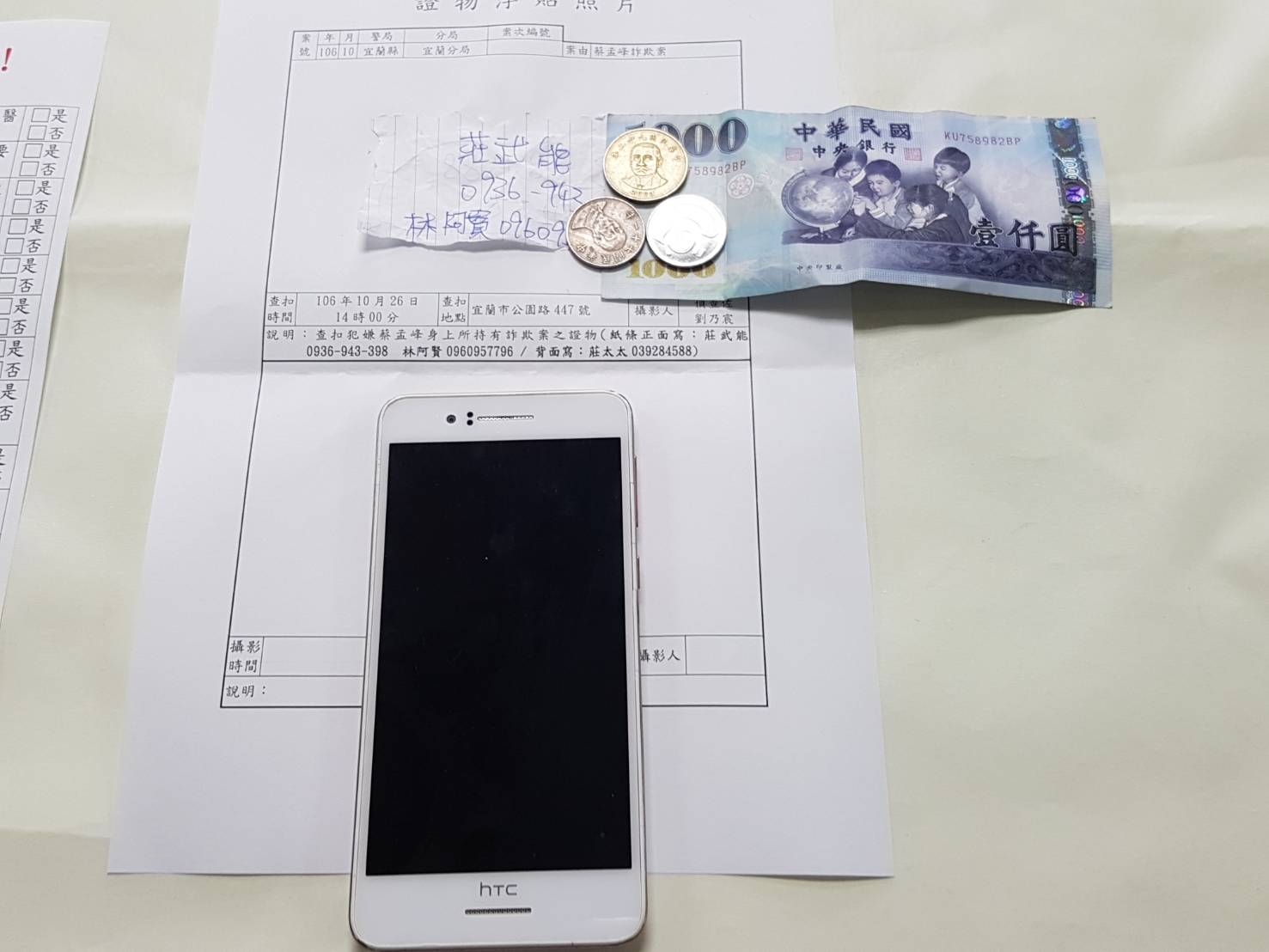 警方查扣蔡嫌身上所持有的詐欺案證物。(記者邱淑珍/攝)