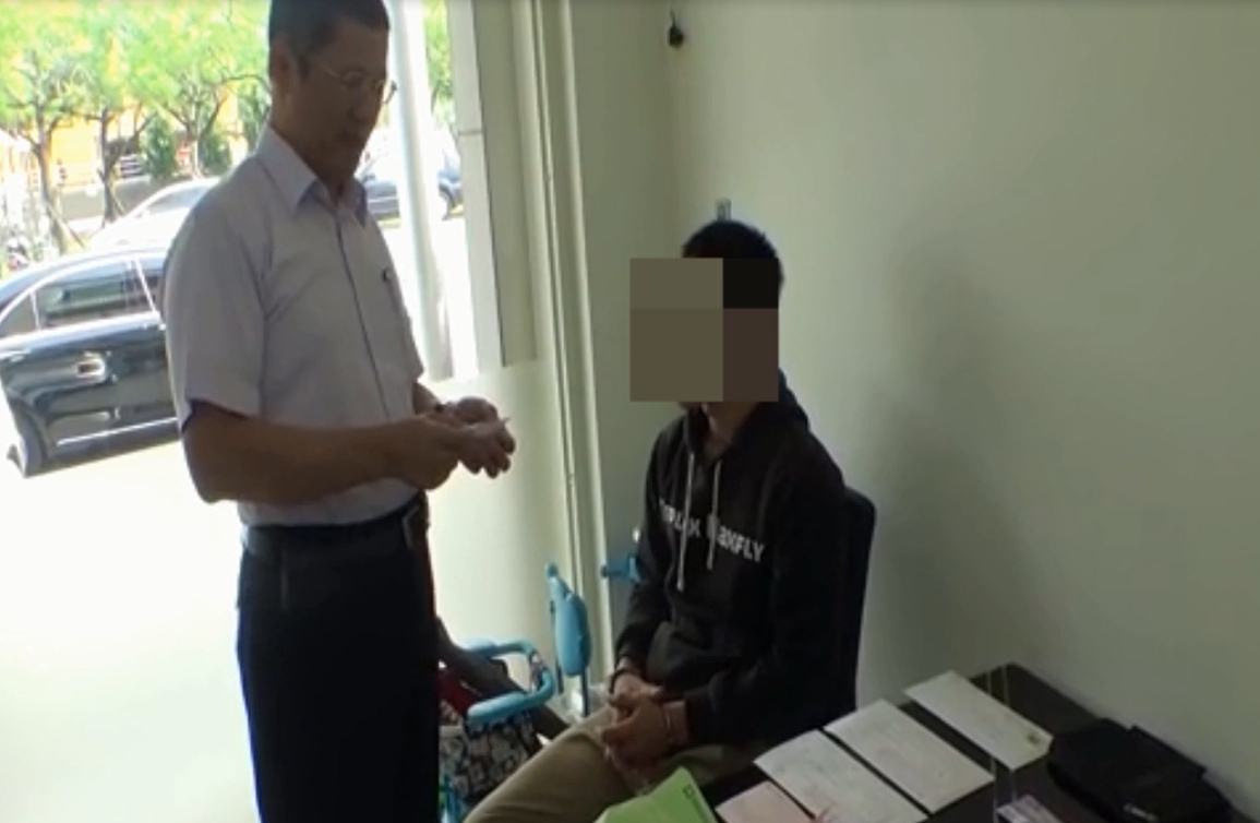 嫌犯看到牛皮紙裡裝的是反詐騙宣導單當場傻眼愣住。(記者邱淑珍/攝)