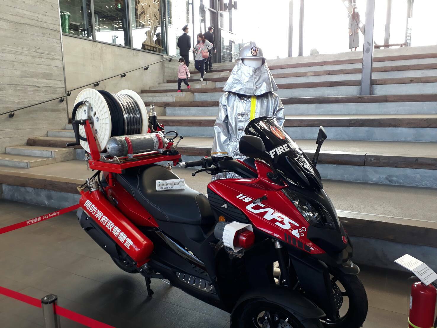 由於現場裝置了穿著各式消防工作服飾的假人,或攀爬、或站坐,全場將消防今昔的演進與實力展現無遺,內容豐富有趣,消防局可謂是下足功夫,誠意滿滿!
