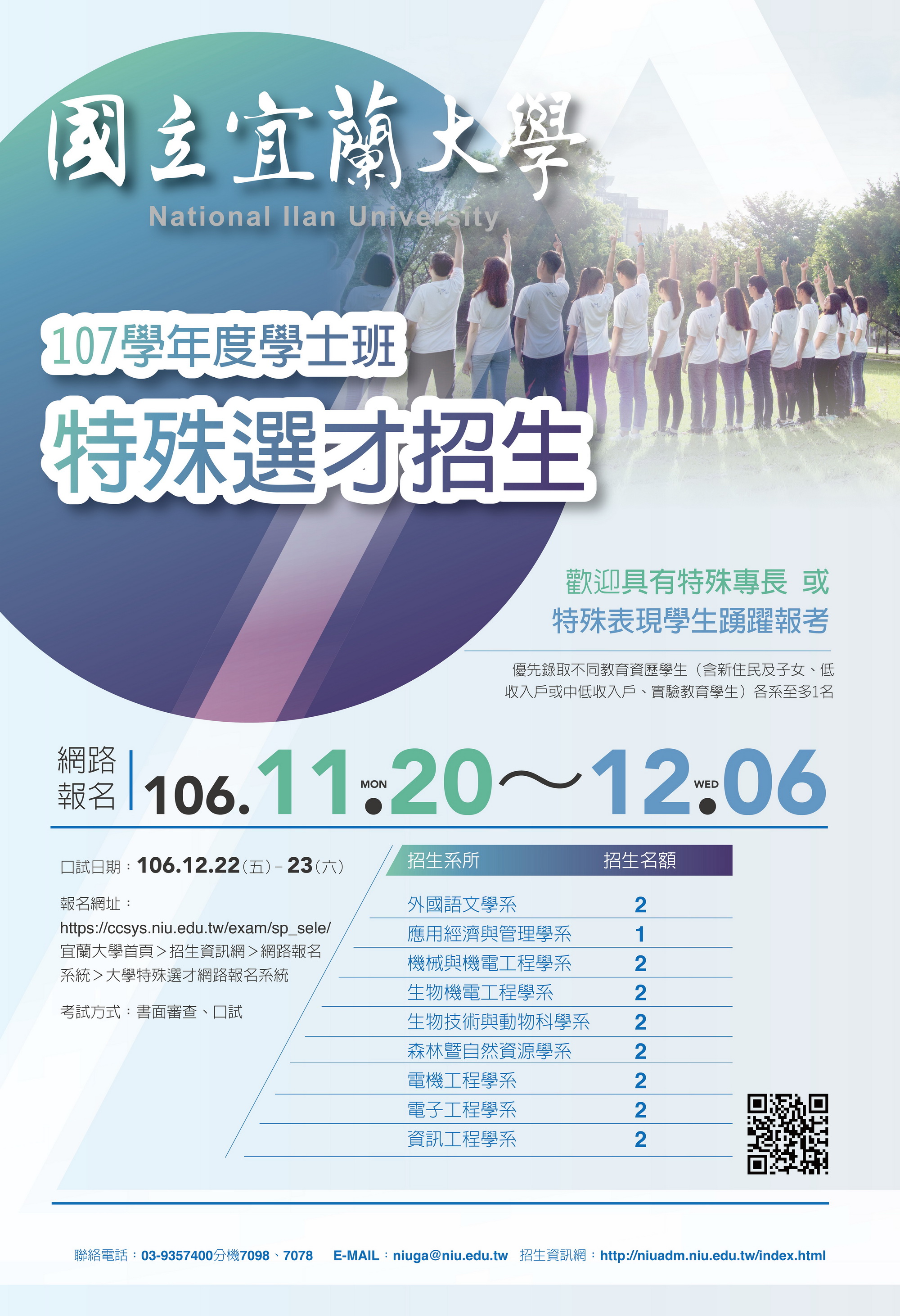 國立宜蘭大學107學年度特殊選才招生簡章已開放網路下載,11月20日至12月6日受理網路報名,詳情可利用國立宜蘭大學招生資訊網(http://niuadm.niu.edu.tw/)查詢,歡迎具專才的學生跳脫傳統的升學考試,進入宜大,在未來一展長才。