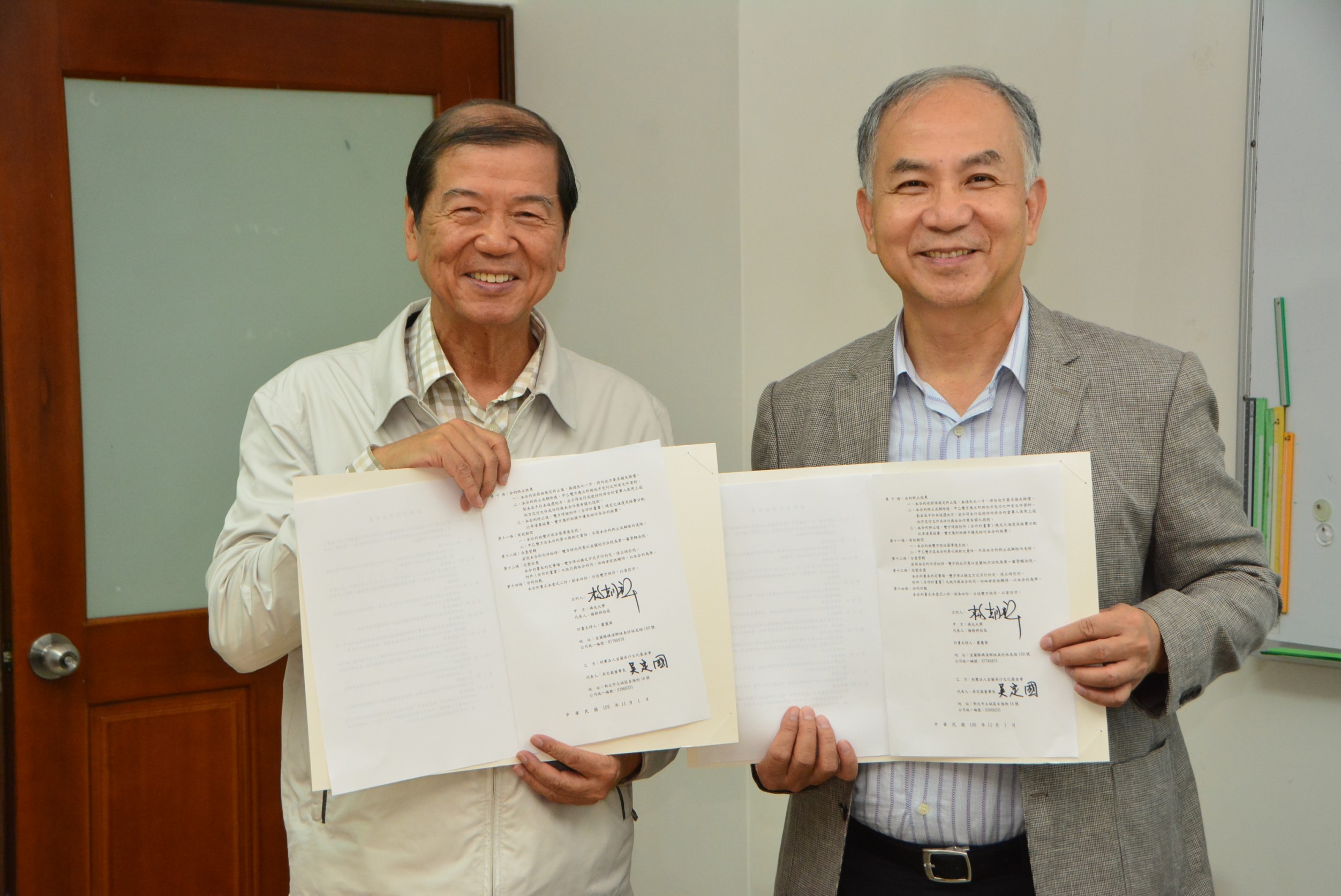 佛大楊朝祥校長與財團法人吳沙文化基金會董事長吳定國簽署策略聯盟協定。〈照片佛光大學提供〉