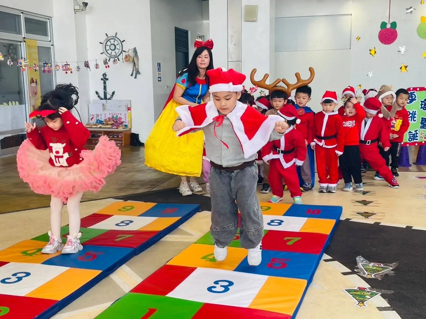 耶誕城中設置卡通總動員服裝秀展演,同時安排語文、認知、體適能闖關遊戲區,透過遊戲增進小朋友的學習。