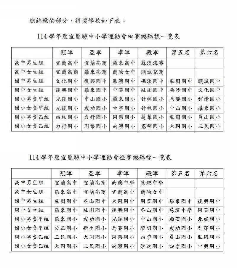 宜蘭縣政府教育處處長陳金奇表示,三天賽程中可以看到各校選手將平時訓練成果充分發揮,在賽場上全力拚搏,不僅為自己爭取佳績,也期望取得代表宜蘭參加全國中等學校運動會的資格。雖然比賽有勝負,但只要在場上全力以赴,每一位選手都是值得肯定的運動員。