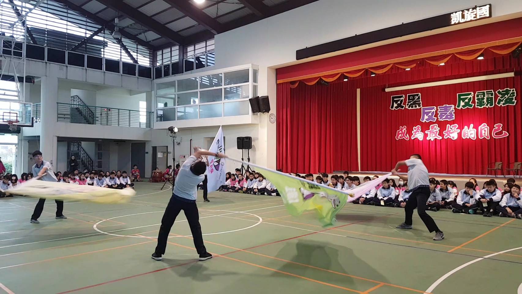 凱旋國中田徑隊的學生,也為來賓表演動感的活力健康操,並配合大旗的揮舞,磅礡的氣勢,代表堅決反黑、反毒、反霸凌的態度,大家攜手將黑幫、毒品、霸凌拒絕在外。