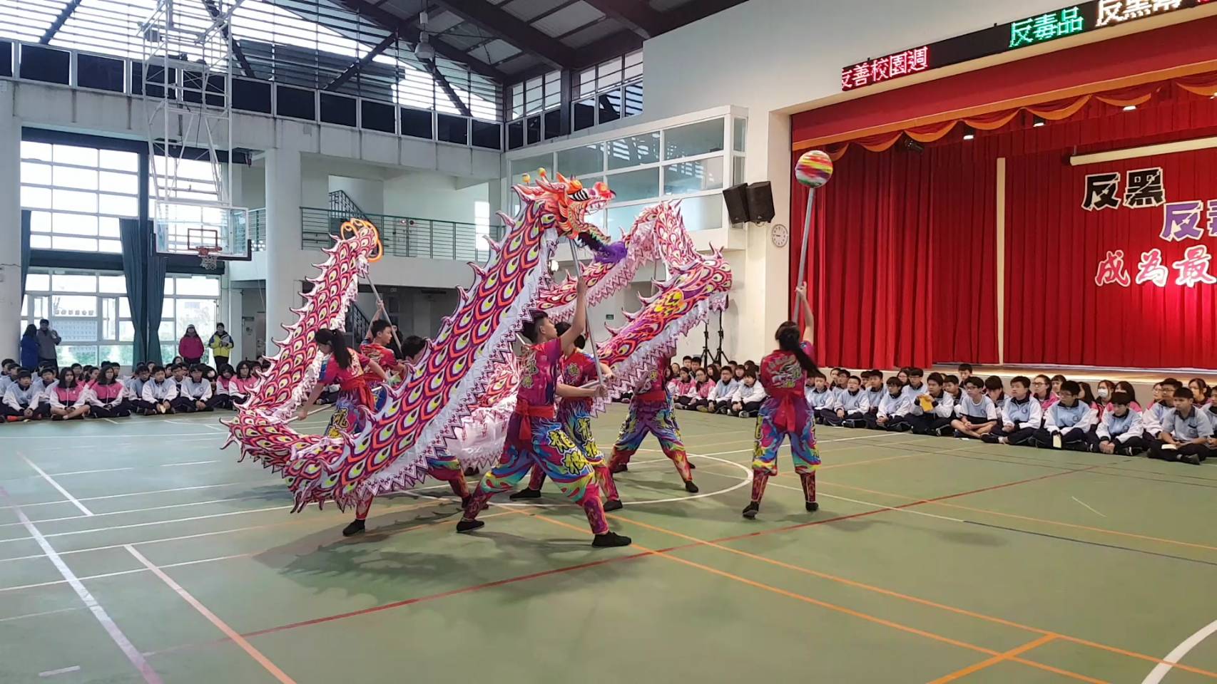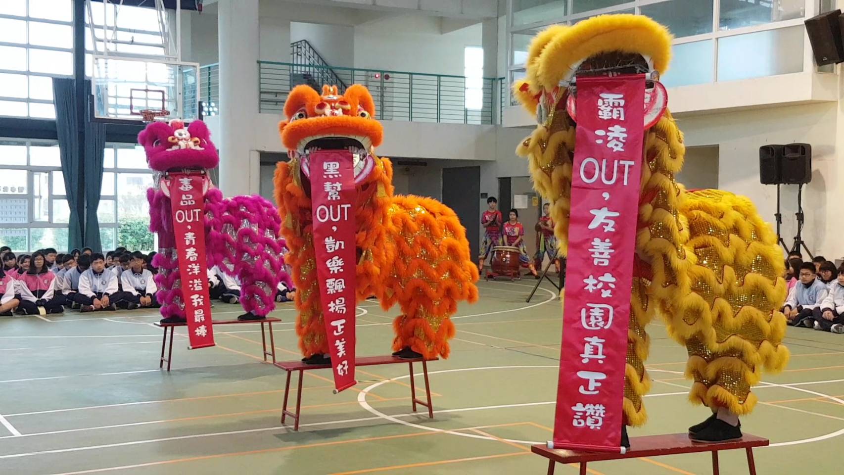 剛過完農曆過年,這週是開學第一週,是校園友善週活動,趁著學期的開始,學校特地舉辦這場有意義的活動。活動一開始由劉靜怡老師率領凱旋國中國樂團揭開序幕,緊接再搭配凱中龍隊的繞場舞動,帶動氣氛,降福凱中,為大家注入正向能量。而一向象徵能祛邪並帶來祥瑞的舞獅也在鼓聲中登場,獅隊靈動的演出,代表凱中祛除邪惡黑幫勢力的決心,希望這次能營造出更友善良好的校園願景及氛圍。