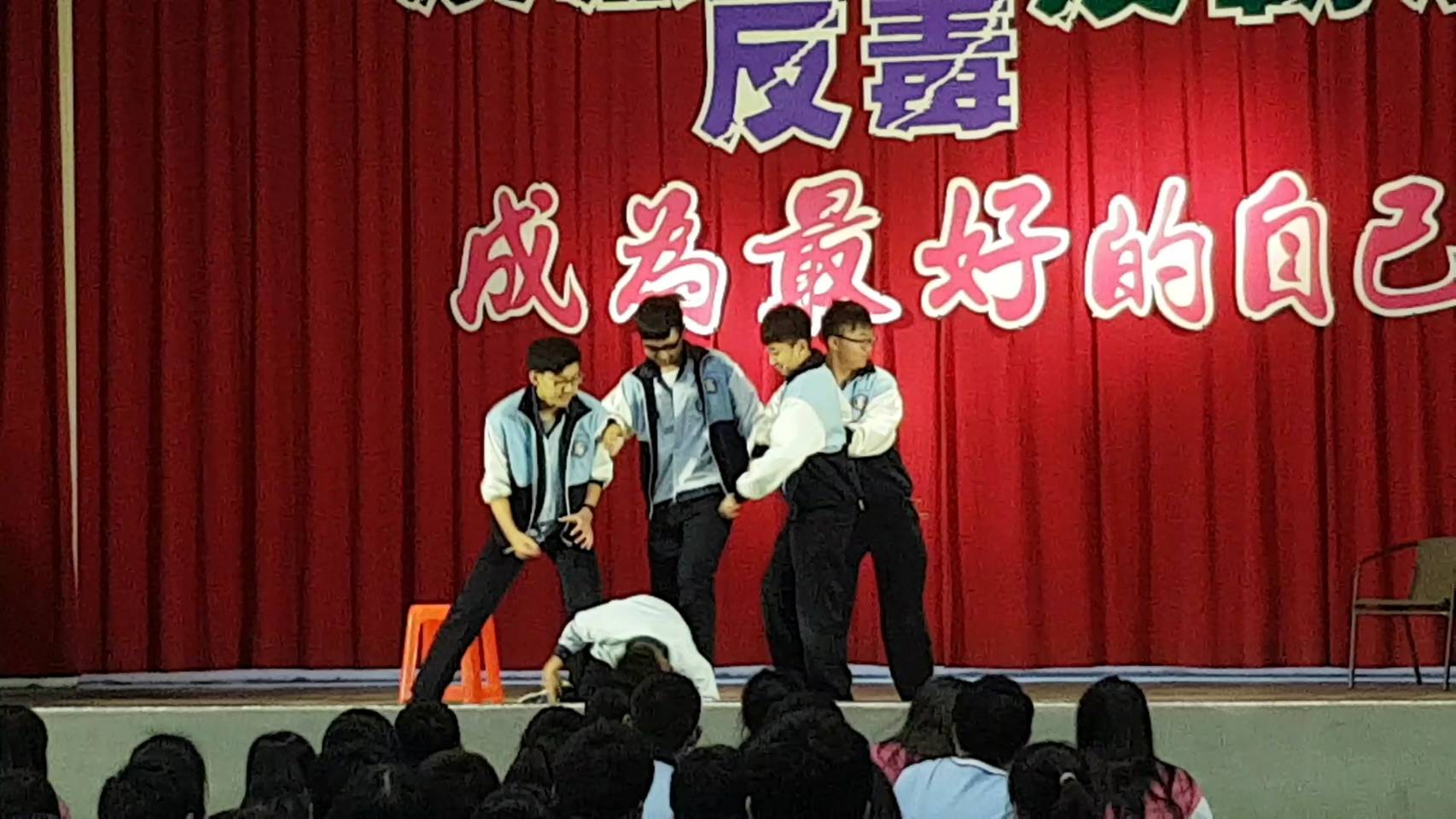 為了讓學生了解霸凌的意義,廣播社與舞蹈社的學生聯手合演反霸凌的小劇場,以活潑生動的動作,再加上詼諧有趣的劇情,讓學生瞭解,當面對霸凌時,應如何處理 ? 透過劇情讓學生知道,沈默忍耐不能解決問題,勇於求助才能避免悲劇!