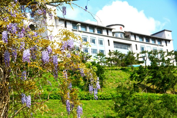 佛光大學校園風光明媚,三月下旬紫藤花盛開,成千上萬串的紫色花海,像是鈴鐺一樣美麗可愛,校方歡迎鄉親遊客把握花期,到校園的懷恩館(小巨蛋)賞花。