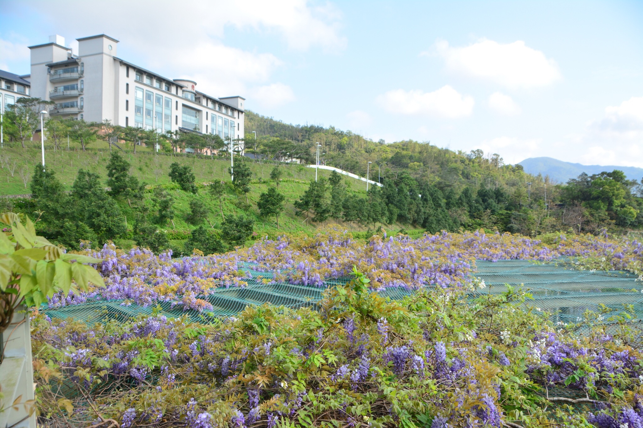 佛光大學小巨蛋體育館戶外花棚,大約十年前開始種植紫藤花,過去幾年都開花,今年開花面積最多,尤其從二樓戶外平台望去,一串串的紫藤花同時盛開,場面相當唯美夢幻。