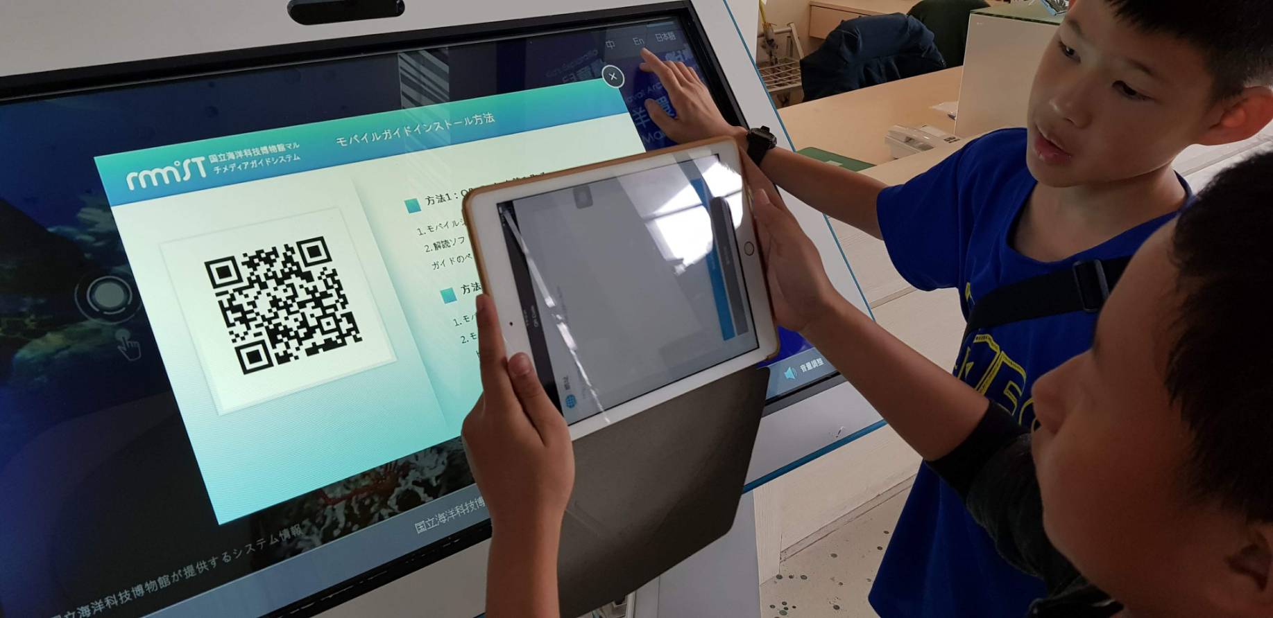 學童在海科館運用平板掃描條碼及查詢資訊進行學習。(照片/黎明國小提供)