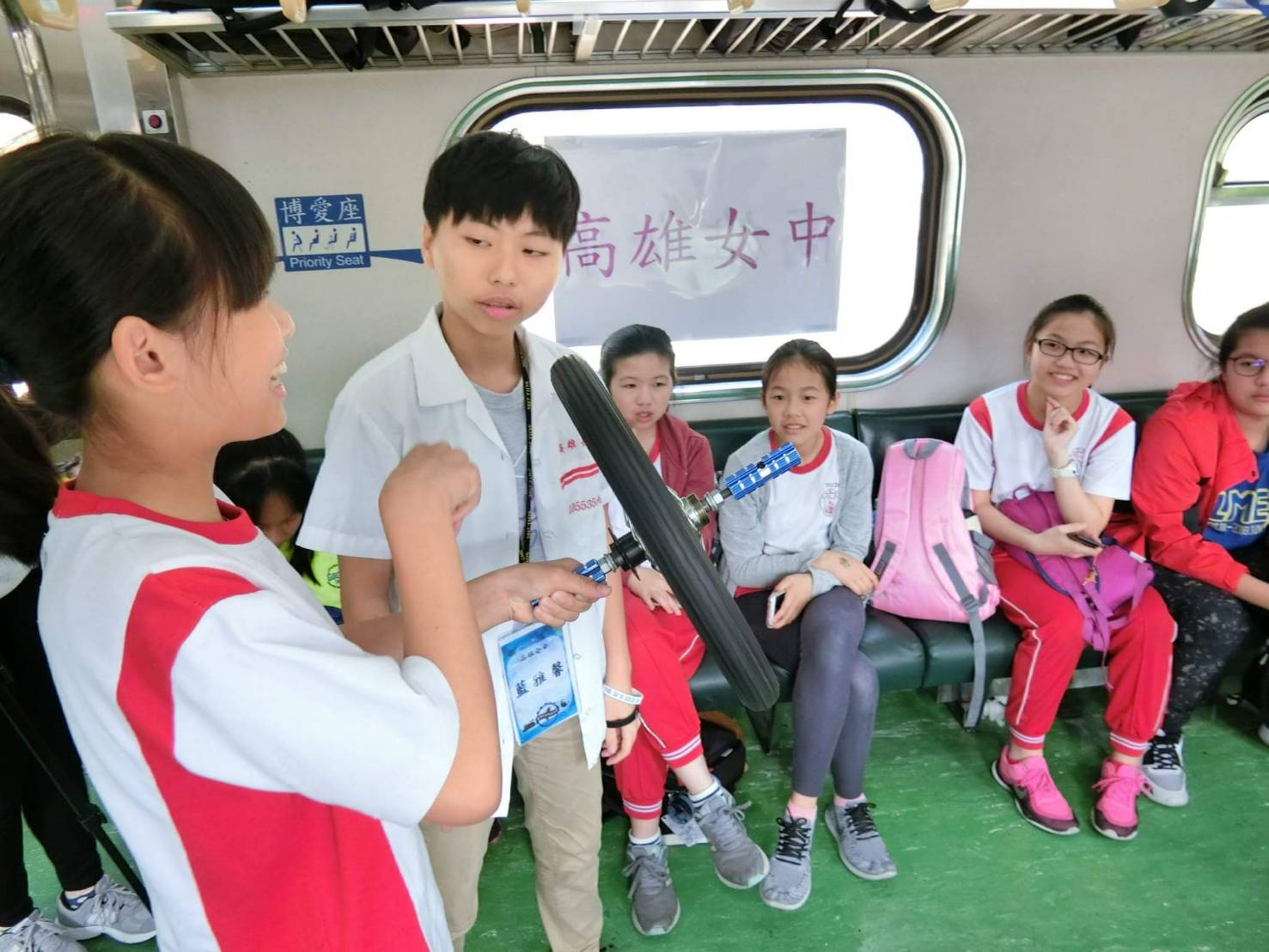 科普列車是一輛四節車廂之區間列車,分別由中女中、中一中、彰女、南一中、家齊、雄中、雄女等優秀學生與美光科技及台灣默克集團負責設計科學實驗活動。乘坐於第一車廂的黎明國小師生,在雄中、雄女多位高中生的指導下進行了角動量、紅綠燈瓶、莫比烏斯環、伯努利原理..等多項饒富科學原理與操作樂趣的科學體驗,車廂內歡呼聲及驚喜聲更是不絕於耳。學童表示能在火車上玩科學是一件很新鮮且好玩的事,不但能夠學習科學知識、更能實作體驗,並享受一同搭火車出遊的樂趣。
