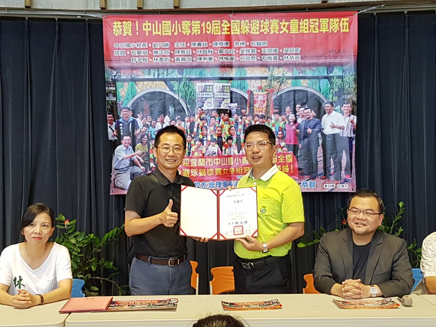 「中華民國第十九屆全國躲避球錦標賽」今年6月初在臺東縣立體育館及臺東縣新生國中舉行,經過幾番激烈競賽後,最後由宜蘭中山國小女生組獲得全國冠軍,此消息傳回學校,除了讓全校師生興奮不已外,市長江聰淵也相當開心。為了獎勵這群小尖兵,市長江聰淵、代表會主席林志勇特地在今(12)日至中山國小小巨蛋進行嘉勉,並頒贈獎勵金給這群優秀的女子兵,並期許她們未來繼續努力。