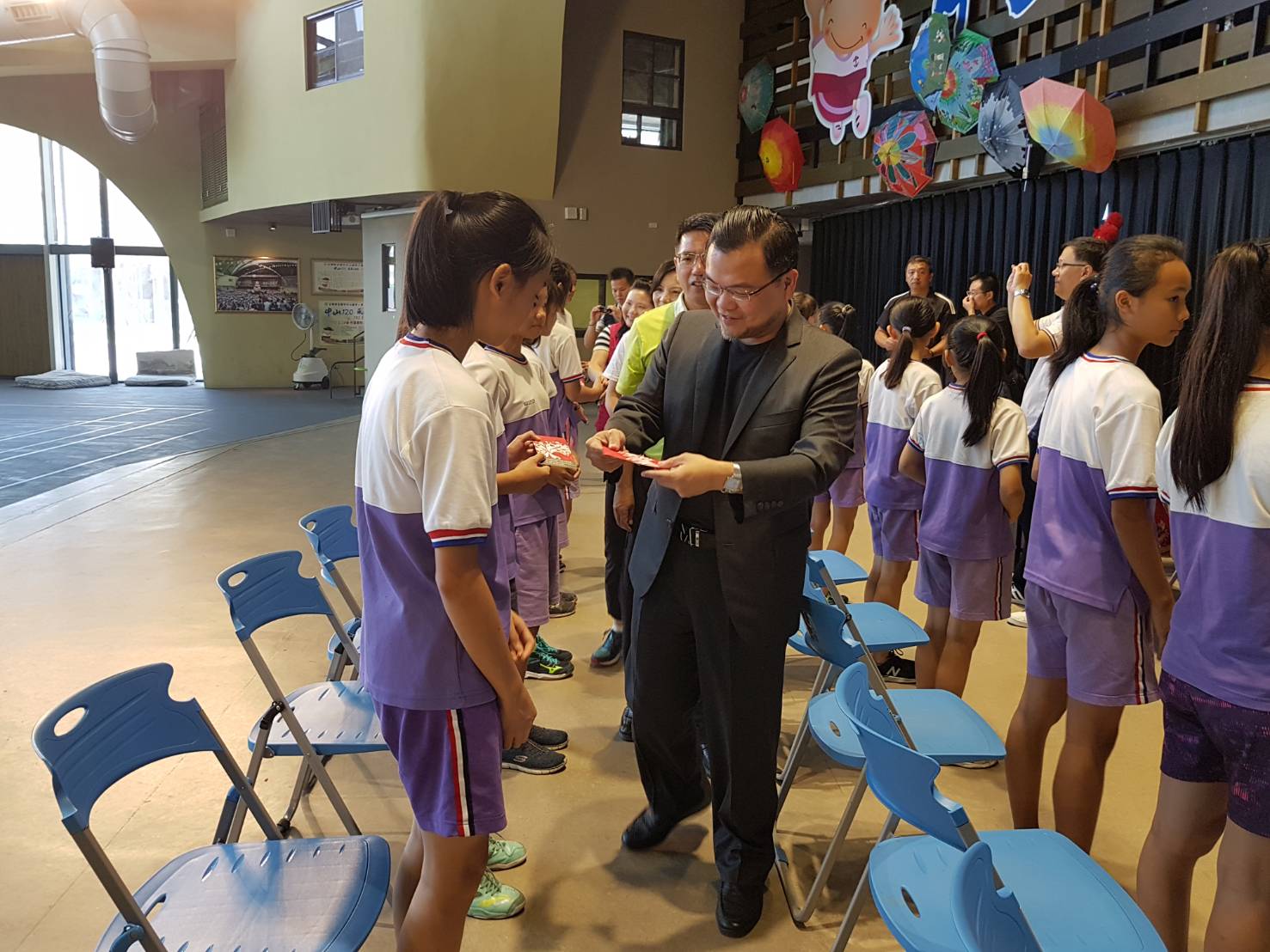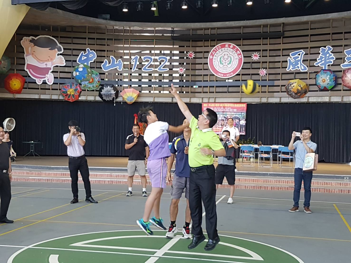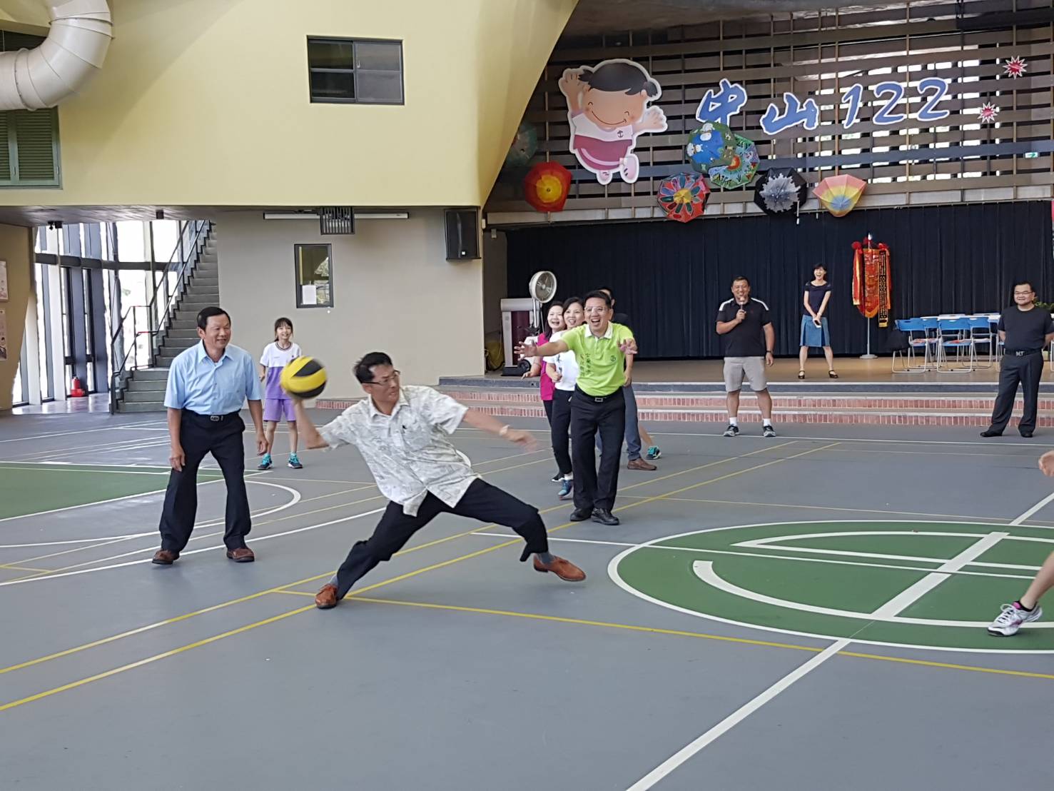 今日除了致贈獎勵金及感謝狀外,為了讓大家一睹中山國小女童組躲避球風采,現場還邀請市長江聰淵及校友會常務理事張日隆等人與女童進行友誼賽,在女學童們一展球技後,江市長等人都快招架不住,直誇 : 太強了!讓現場增添了許多「笑」果。