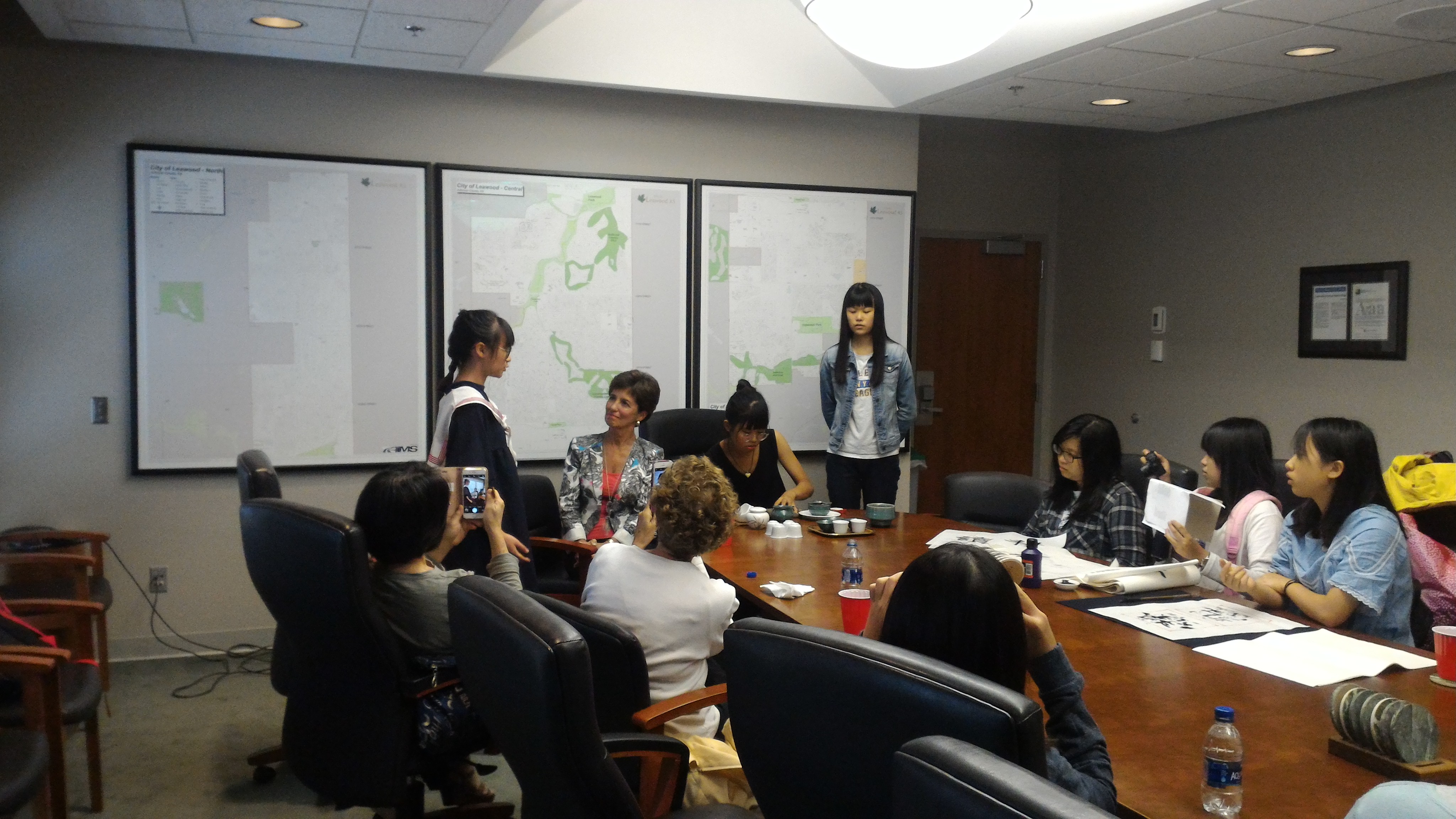 在美國的交流活動中,蘭女同學也將校內的特色多元選修課程「茶席與生命教育」中所學到的茶道文化與黎霧市長佩吉、姊妹校師生、Host Family爸媽分享。此外,楊子郁同學的書法表演特別受到歡迎,當場揮毫的作品被索取一空,作了非常成功的文化交流。