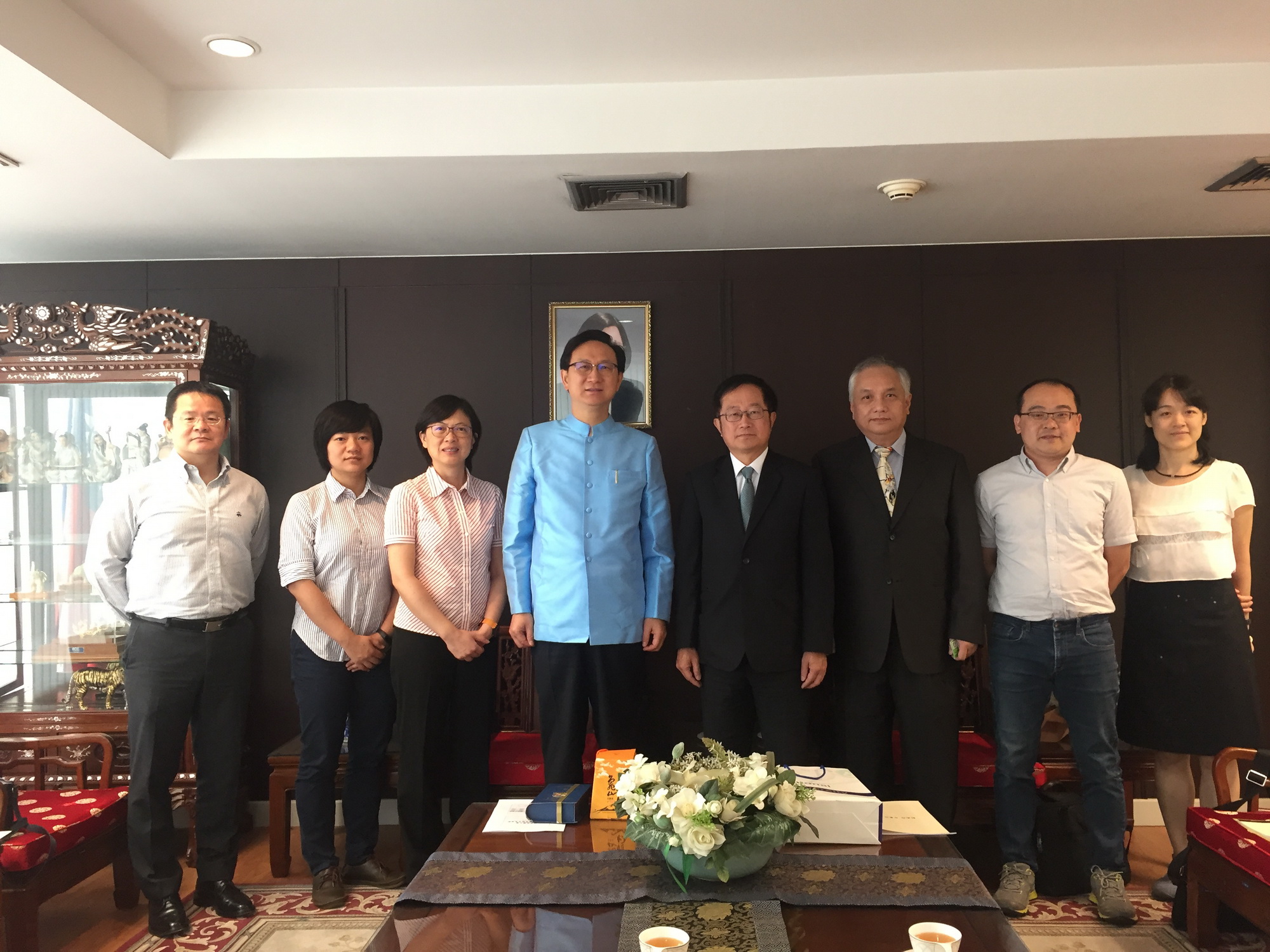 由於駐泰國台北經濟文化辦事處(Taipei Economic and Cultural Office in Thailand)也是此行的重要行程之一,因此吳柏青校長率領三位師長,一同拜會駐泰國台北經濟文化辦事處-童振源代表,報告宜蘭大學近年來在泰國的深耕及協助農業發展。