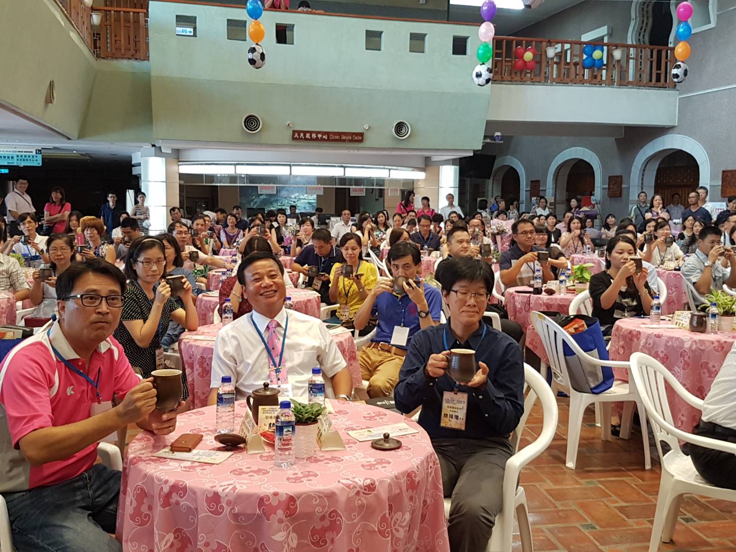 928是至聖先師孔子誕辰,為了紀念偉大的孔子特地訂為教師節,有感老師們平日的辛勞,今天在「春風化雨育英才,百年樹人傳師道」活動中,吳代理縣長帶領貴賓在台上向台下的獲獎者「敬茶」,以表達對師長的景仰與敬意,亦傳達對教育人員的期許,台下教師們也端起茶杯回禮。