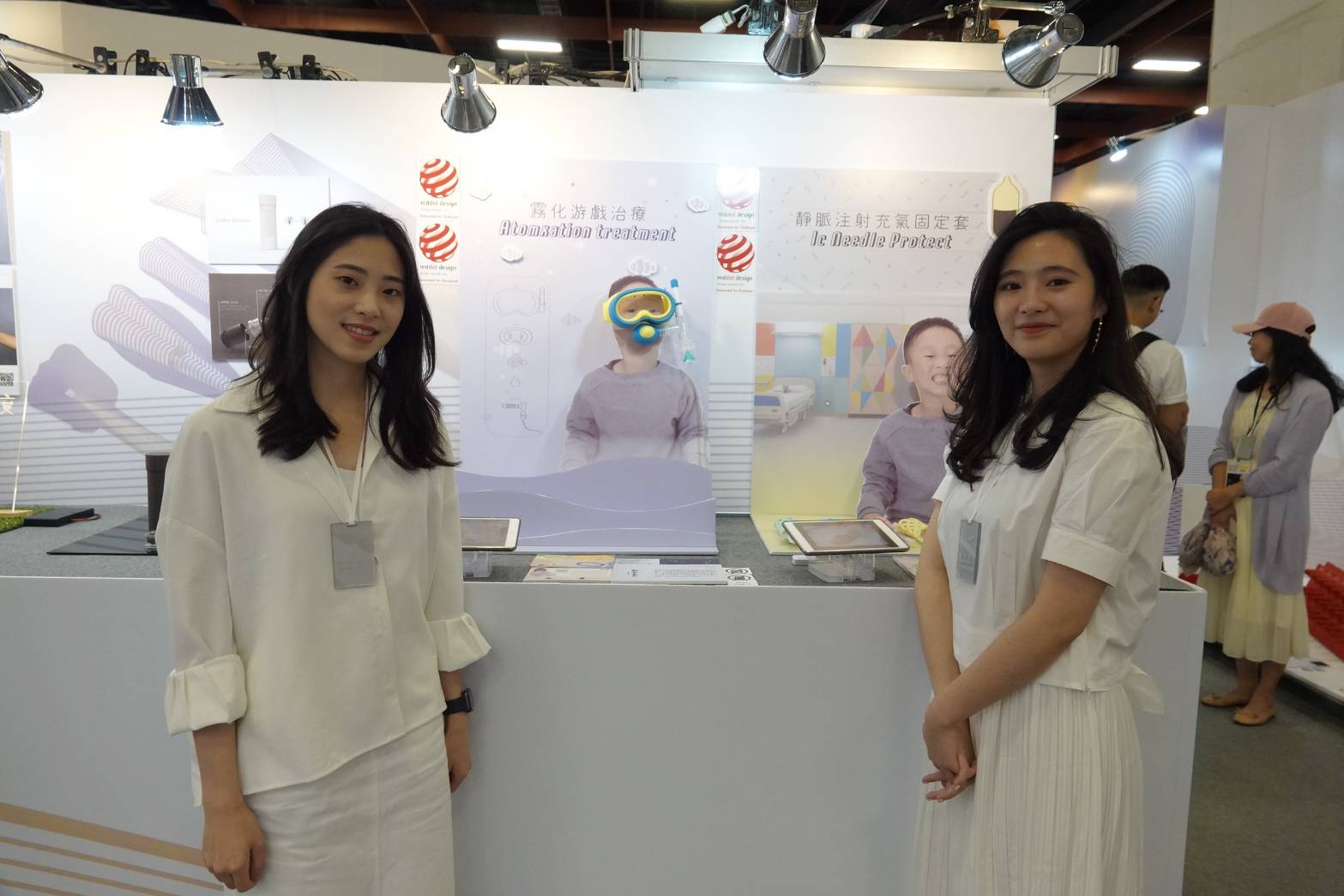 另外,一共入圍六項「國際紅點設計獎」的大四生林正昀與董其芮,此次也特別在現場展出及分享理念。由於看見學齡前孩子對於看醫生的恐懼,因此設計出一系列兒童治療相關的器材,包含「IC needle protect」固定器、「Inflammation sensor」發炎感溫貼、「Atomxation treatment」霧化治療,林正昀與董其芮為了讓他們的設計能夠真的實用於社會,跑了好幾次醫院,讓醫護人員作體驗,期待這樣的設計,未來能讓怕害看醫生的孩子都能勇敢就醫。