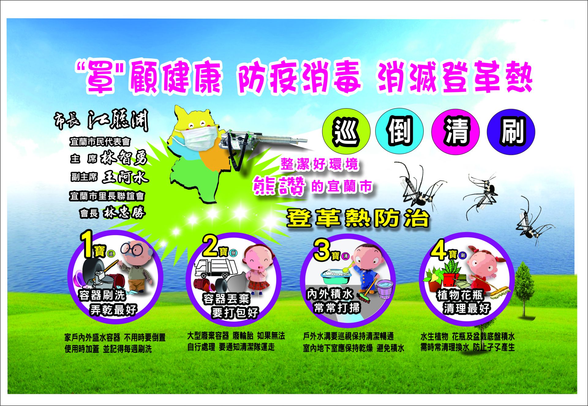 江市長說,宜蘭市將於6月5日到7月5日安排消毒防疫工作,預計編成二組共計8人,展開全市38里及21所學校全面噴藥消毒(消毒排程如附件)。本年度除例行性使用消毒車進行夜間消毒外,另外針對通風良好公寓大廈中庭或社區,使用煙霧式消毒機進行日間消毒。煙霧機所產生的濃霧可迅速殺死飛行中蚊蟲,其攜帶輕便可以進入消毒車無法到達的場所。宜蘭市清潔隊也每日派員進行重點道路的清潔整頓及道路側溝的清疏作業,以避免水溝內阻塞造成隱藏性的積水而孳生病媒蚊。