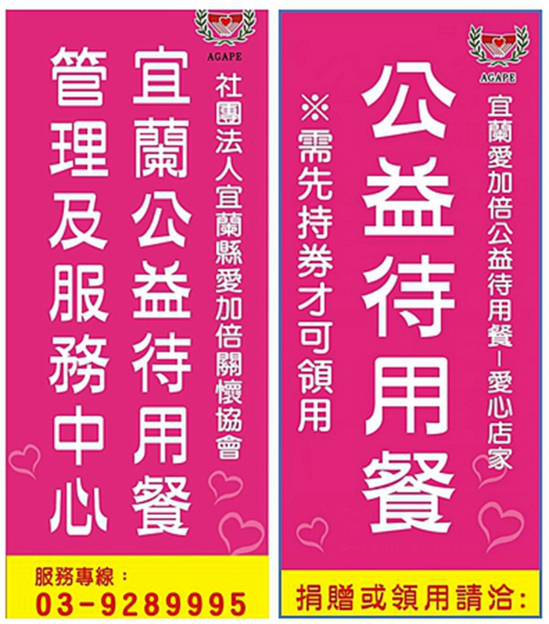 宜蘭縣愛加倍協會表示,新成立的“公益待用餐管理及服務中心”是由宜地區熱心店家、教育人員、社區志工與專業社工等熱心人士組成,提供弱勢族群免費食物餐券,使其免於遭受飢荒之苦。
