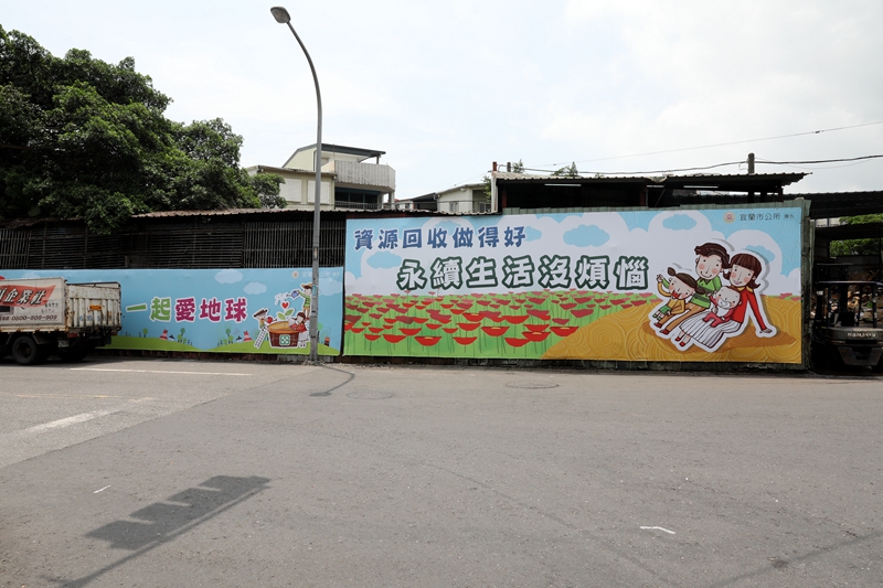 宜蘭市環河路及文昌路口,是由金六結及慶和橋等地進入宜蘭市區的交通要道,每天往來的車流量相當多;也是市民散心運動,眺望宜蘭河景的好去處。這個交通要衝的地點旁有一處資源回收場,鐵皮外牆因為氣候潮濕,風吹日曬雨淋而斑駁鏽蝕,破損不堪,長期下來嚴重影響市容觀瞻,經市公所與業主協商後改善。