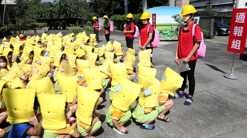 宜蘭市立幼兒園最近分別舉行防災演練,透過演練來熟悉突發災害的應對程序,發生地震了!在幼兒園老師的引導下進行地震避難演練,請幼兒們立即採取~「趴下、掩護、 穩住」的動作,就地掩避保護頭、頸部。