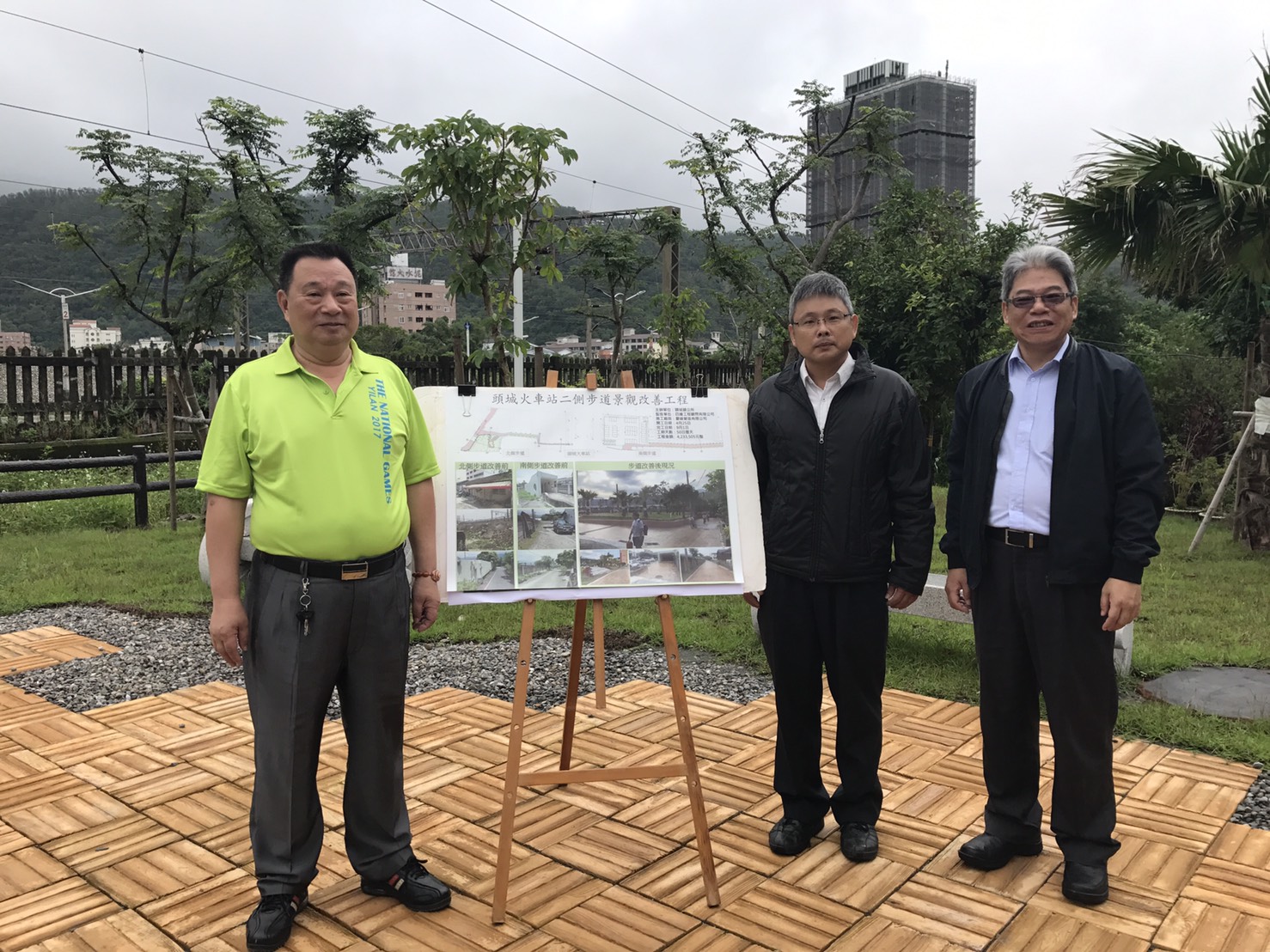 鎮長曹乾舜表示頭城火車站是頭城鎮主要的門面,很高興去年在地方人士的爭取以及立委陳歐珀的協助之下,鐵路局完成了站體的整修,讓頭城火車站煥然一新。為了讓環境的改善更加的全面,乾舜特別指示公所相關單位積極提案爭取,「頭圍景觀步道」的延續計畫-「火車站兩側沿線步道景觀改善工程」,104年底提案獲得內政部營署審核委員的認同與支持,核定新台幣500萬元執行此項工程,其中營建署補助80%,公所自籌20%。本案特別要感謝鐵路局能夠無償提供鐵路用地,讓我們來施作景觀步道和小公園。公所用心來營造、改善我們的生活環境,歡迎大家多加利用,同時也希望大家共同來維護這得來不易的美麗景觀與設施。