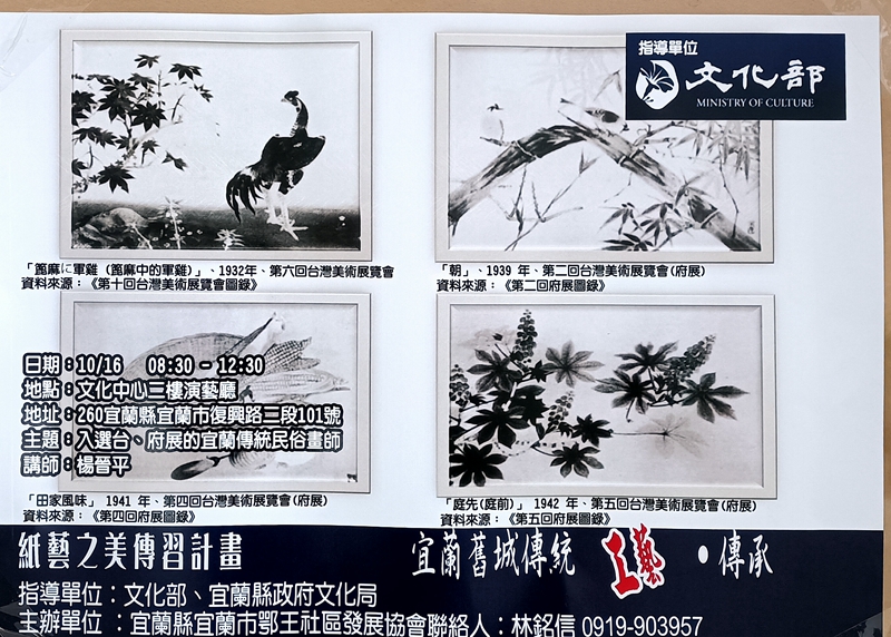 宜蘭縣政府文化局舉辦「紙藝之美傳習計畫」,推廣傳統工藝之美。文史工作者楊晉平老師表示,在日治時期的全省美展,傳統美術民俗畫部分,宜蘭也有游本鄂和林海樹等兩位畫家的作品入選。
