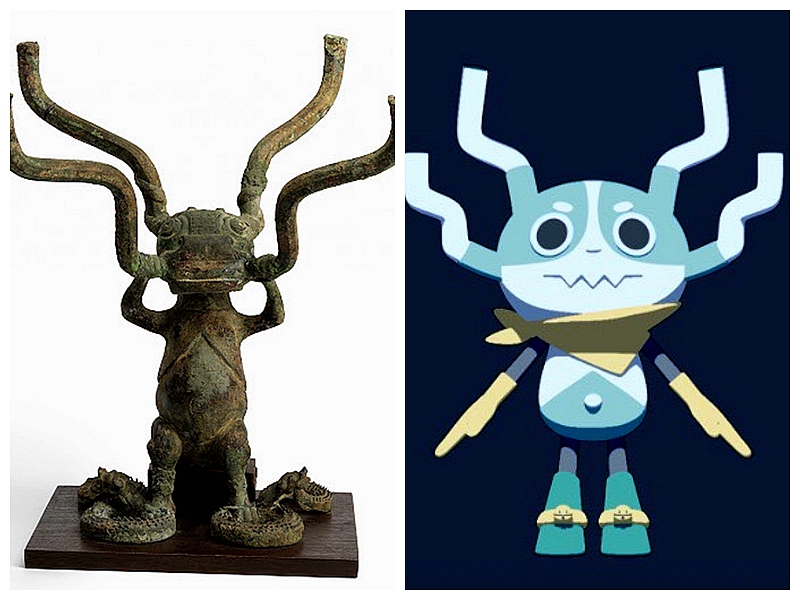 這座春秋時代,高47cm ,長34cm ,寬30cm的國寶「獸形銅器」,典藏於國立歷史博物(館藏編號:天字69 h289),獸形器座原為春秋中期中原鄭公大墓出土。這件從河南新鄭出土的獸面人身的座狀物,具有獸面、大眼、張口、人身的特徵,雙足各踏一蟠曲的蟠蛇,造型威猛,頭部有四條向上的曲柱殘痕,其上所承之物已失,或屬案座類等物。此器為春秋青銅器中具有奇特寓意、獨一無二的獸面人身像,因造型奇特,在古文物中絕無僅有,是研究春秋時期非常重要的青銅器,經國家指定為國寶後,目前館藏於國立歷史博物館。