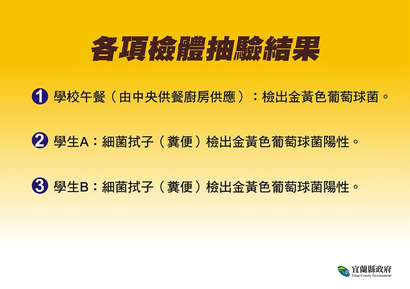 宜蘭縣今(110)年11月23日發生9所學校86名師生,用過營養午餐後因食品中毒送醫。衛生局將食物檢體送驗結果出爐,經專家綜合研判後確認為中毒事件,縣政府除移送司法機關偵辦外,並自即日起與廠商終止契約,另協調合格團膳業者持續供餐,確保學童營養午餐如期如質供應。