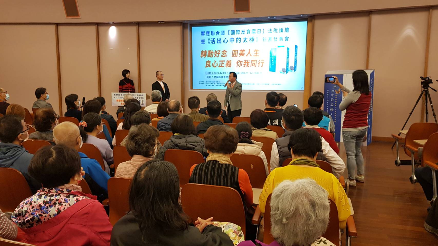 台灣財經刑法研究學會今天9日在宜蘭縣議會舉辦~【活出心中的太極】新書發表會、暨響應聯合國「國際反貪腐日」法稅論壇,縣長秘書陳志信及議長特助陳金麟,分別代表林姿妙縣長和張建榮議長出席,及致詞,並接受聯合國/NGO世界公民總會秘書長李斐隆代表贈書。希望這本書可以推廣給宜蘭縣民,讓人人都能學習陰陽平衡的智慧,迎向更美好的人生。
