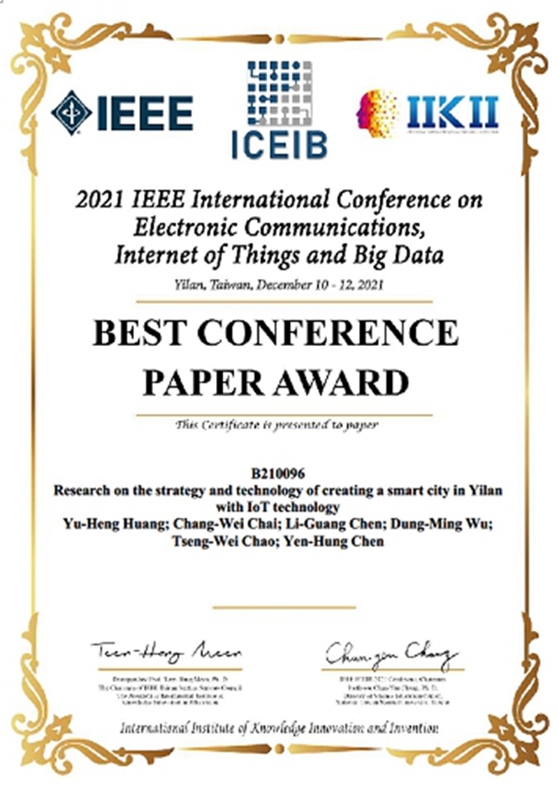 日前在礁溪舉行的「IEEE ICEIB 2021國際研討會」,入選的99篇論文要經過全程英文發表,評審結果「宜蘭智慧城市」研究團隊的論文,獲得評審委員的一致肯定,拔得頭籌,今天在台北授獎。