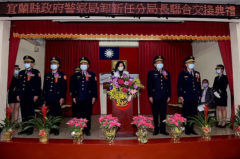 林姿妙縣長致詞時說,她代表全體縣民滿懷期許,希望借重各位新任幹部的長才,為宜蘭縣治安及交通工作共同打拚。另外,前主任秘書蘇榮明榮陞臺南市政府警察局督察、宜蘭分局前分局長張文峰榮陞連江縣警察局督察長、蘇澳分局前分局長潘嘉旺榮調彰化縣警察局北斗分局分局長,也於今日至新職機關報到,在此感謝他們在宜蘭縣服務期間的努力與付出,並祝福他們未來步步高陞。