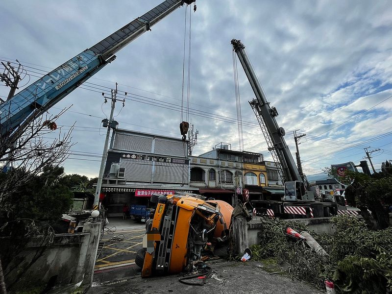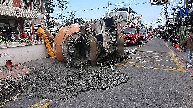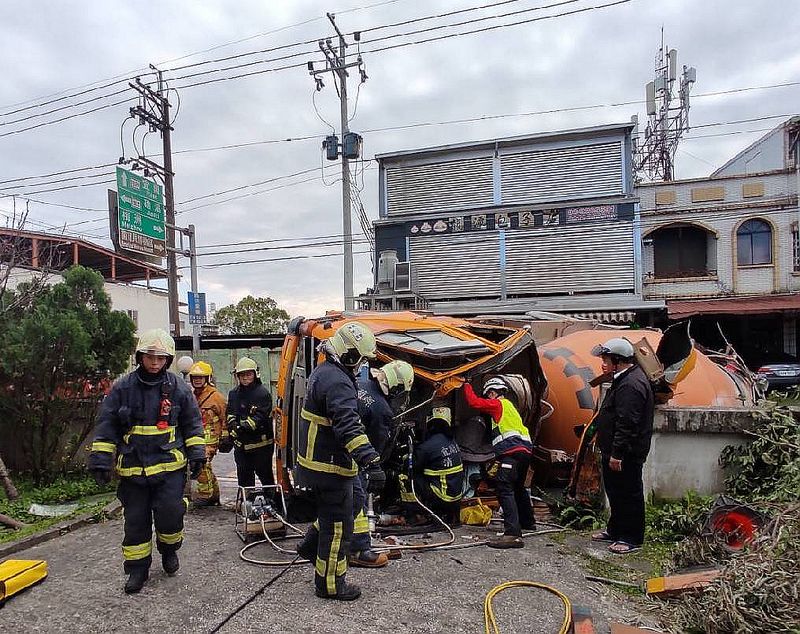 宜蘭縣一輛預拌混凝土車和一輛小客車今天下午發生交通事故,預拌混凝土大貨車撞及龍潭派出所圍牆翻覆,陳姓駕駛受困車內雙腳遭變形車體夾傷,但意識清楚,經救災人員送陽大就醫。