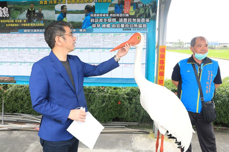被國際列為極危物種的西伯利亞白鶴,自去年11/15在宜蘭現蹤,也吸引了各地民眾前來觀賞,市公所為了守護牠,讓牠能平安在宜蘭棲息休養,也做了許多功課~集結社區農民及愛鳥志工們的力量,為避免牠受到驚擾,市公所在白鶴棲息地四週架設告示牌及設置臨時停車場,請民眾遵守現場秩序,保持安靜不喧譁;為確保白鶴可以安心無虞的在此覓食休養,市公所積極協調白鶴棲息地附近農民,以翻田蓄水,並停用農藥、肥料及除草劑等的友善耕作方式,並且在棲息地附近四週架設攝影機及每日派員觀察追蹤與記錄。